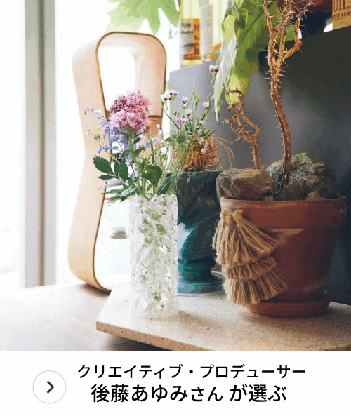 「職業上、花器はよく見ているんですが、〈KEISUKE ISHII〉のフラワーベースは、これまでに見たことがなかったデザイン。まるで凍っているみたいに見えて、ハンドメイドならではのひとつひとつ個体差も魅力があり、表情も豊か。そのユニークさに惹かれました」(後藤さん)