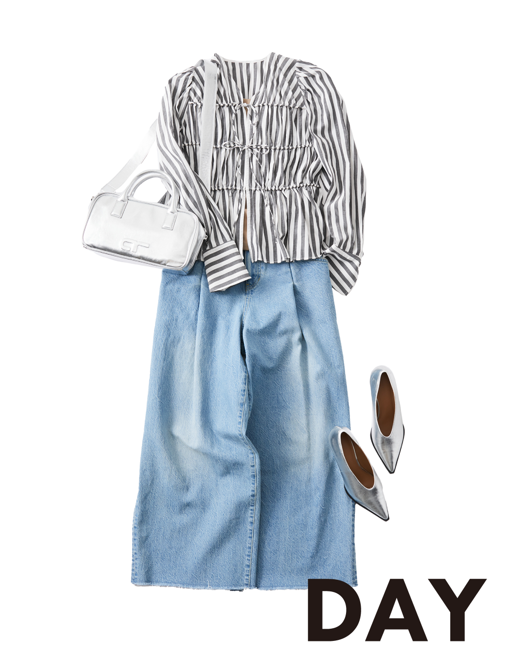 ワイドデニムにシルバー小物でコーデにアクセントを