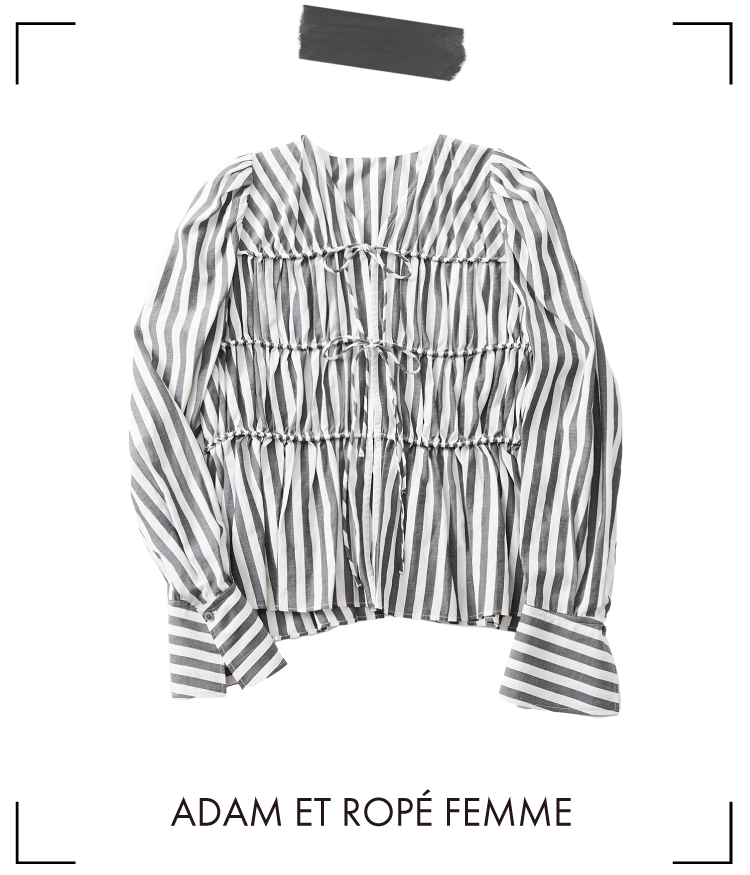 ストライプのグレーと色味を合わせた2タックワイドスラックスは、大人が嬉しい、力の抜けたきちんと感が魅力。すっきりとしたストレートシルエットが美脚へと導きます。小物をブラックで統一することで、オフィスにもぴったりな大人スタイルに。