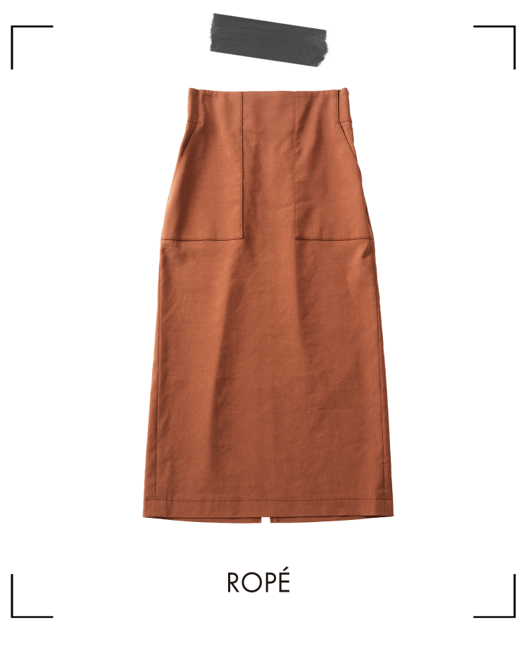 タイトスカートはそのままに、ナチュラルな色味のシャツと小物を合わせた上品リラックススタイル。伸縮性に優れたタイトスカートは、見た目はすっきりとしながらも動きやすいので、ちょっとした外出にもプチ旅行にもおすすめです。