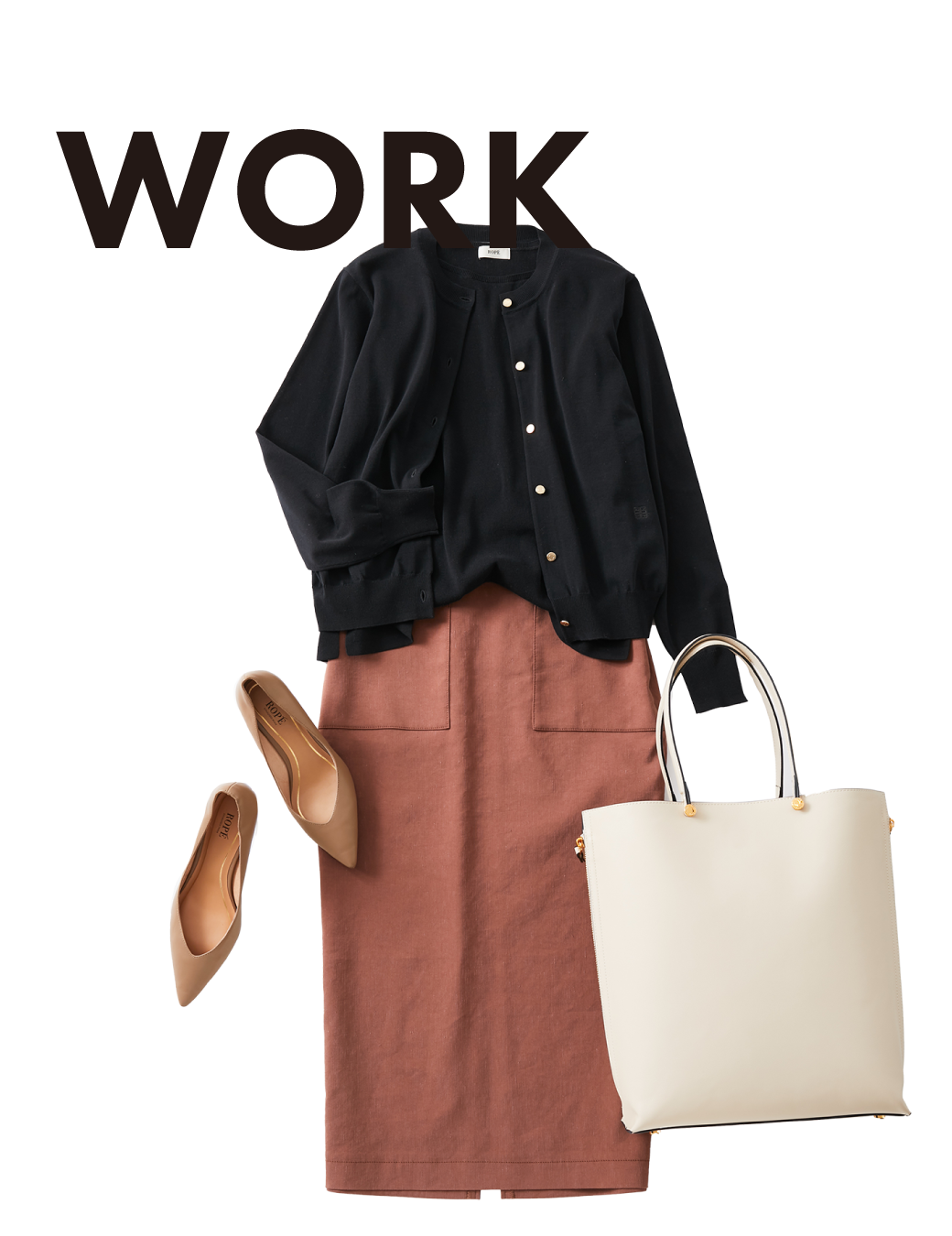 伸縮性に優れたタイトスカートは、着用しやすくカジュアルすぎない着回し抜群のアイテム。PCも余裕で入るバッグと合わせて、オフィスでも商談で外出するときでも便利なスタイルの完成。