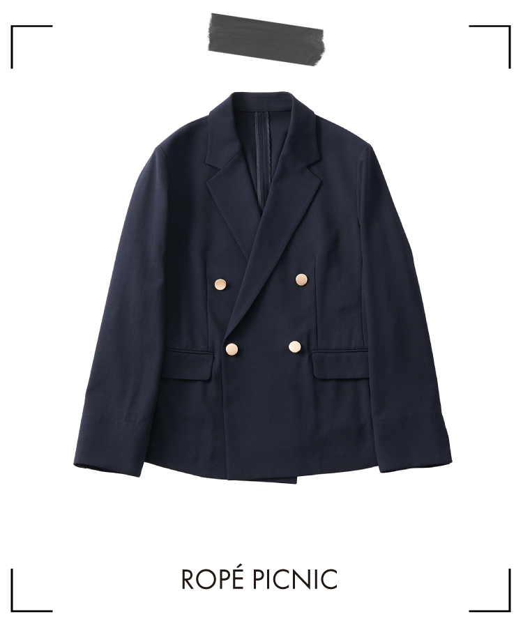 ゴールドボタンが上品なジャケットは、オンオフ使える万能アイテム。パンツもネイビーで合わせれば、どこに行っても通用する清潔感のあるスタイルに仕上がります。