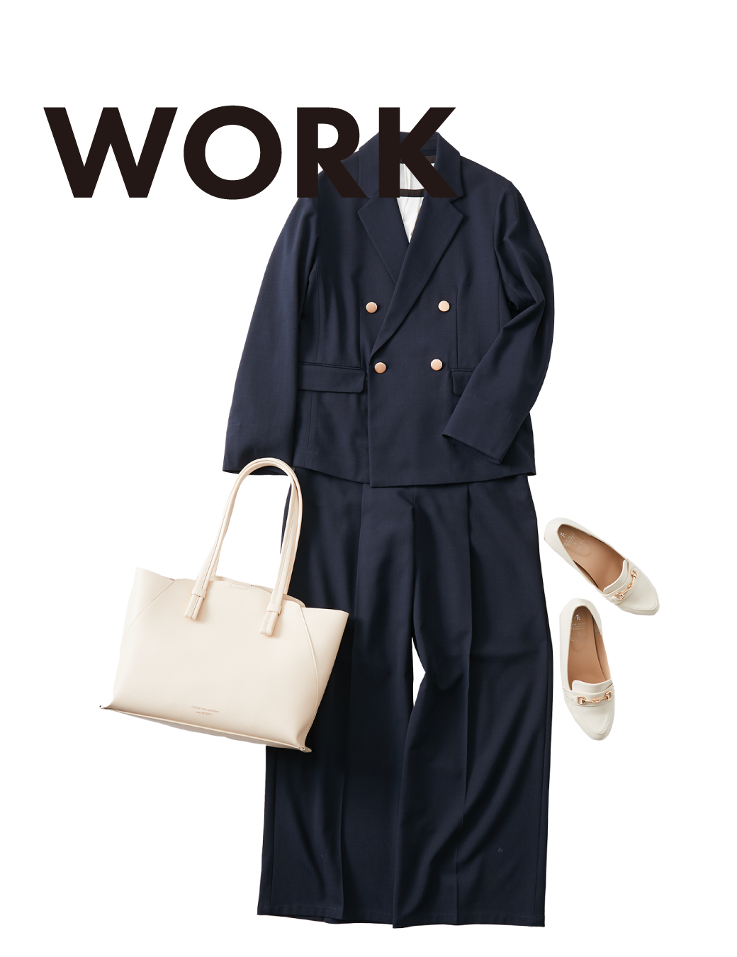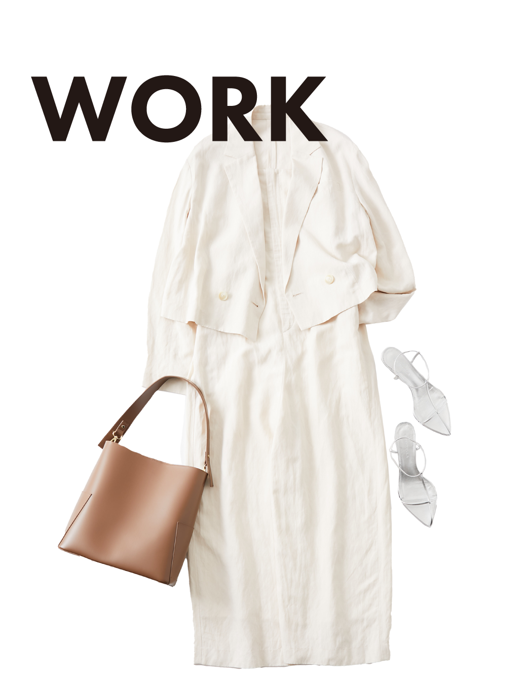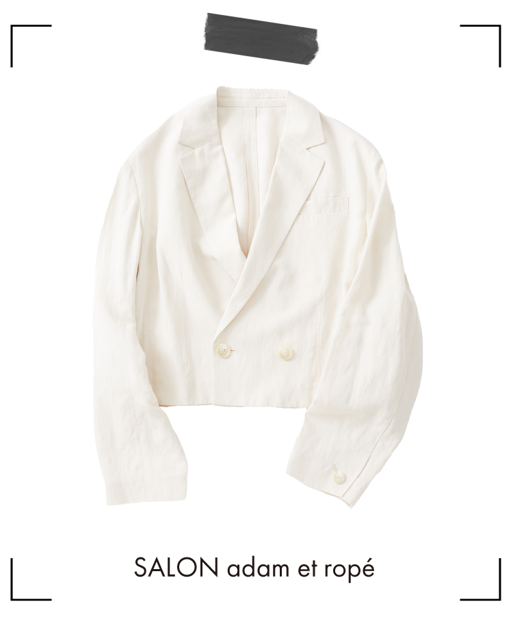 シャツのようにサラッと羽織れるショートジャケットは、素材はナチュラルでも品のあるシルエットなので、オフィススタイルにもしっかりと馴染みます。ipadも余裕で入るブラウンのバッグは肩掛け部分が太めのデザインなので、仕事の書類もしっかり収納できます。