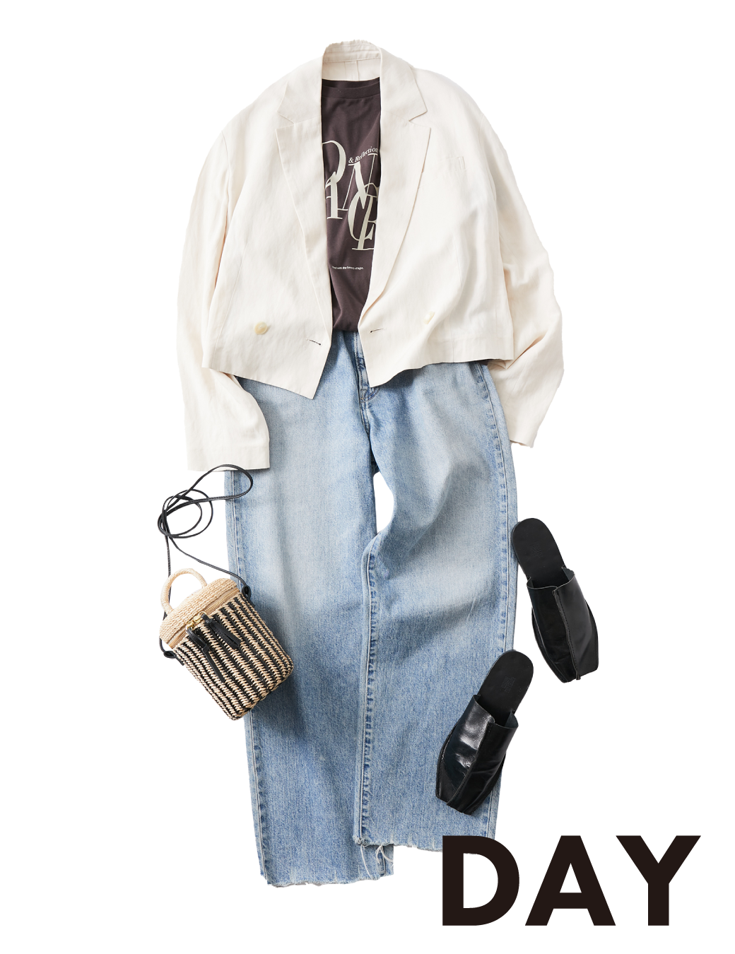 シャツ感覚で羽織れる軽やかな素材が魅力のジャケットは、デニム&Tシャツスタイルとも好相性。馬皮を使用したオープントゥバブーシュと夏らしい素材の小型のカゴバッグで、初夏のリラックススタイルに。