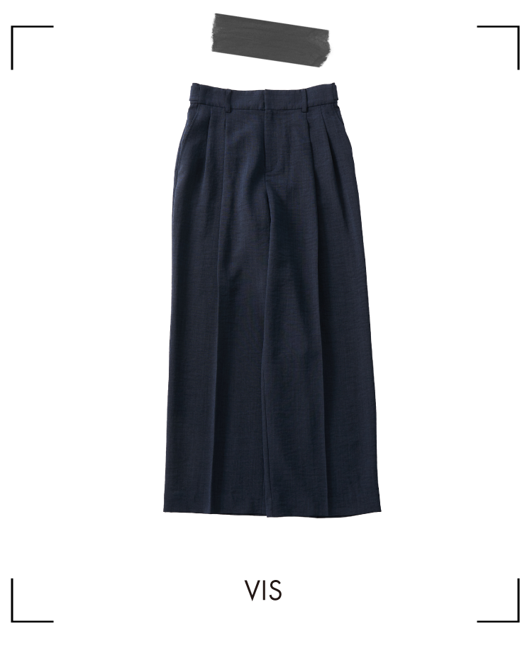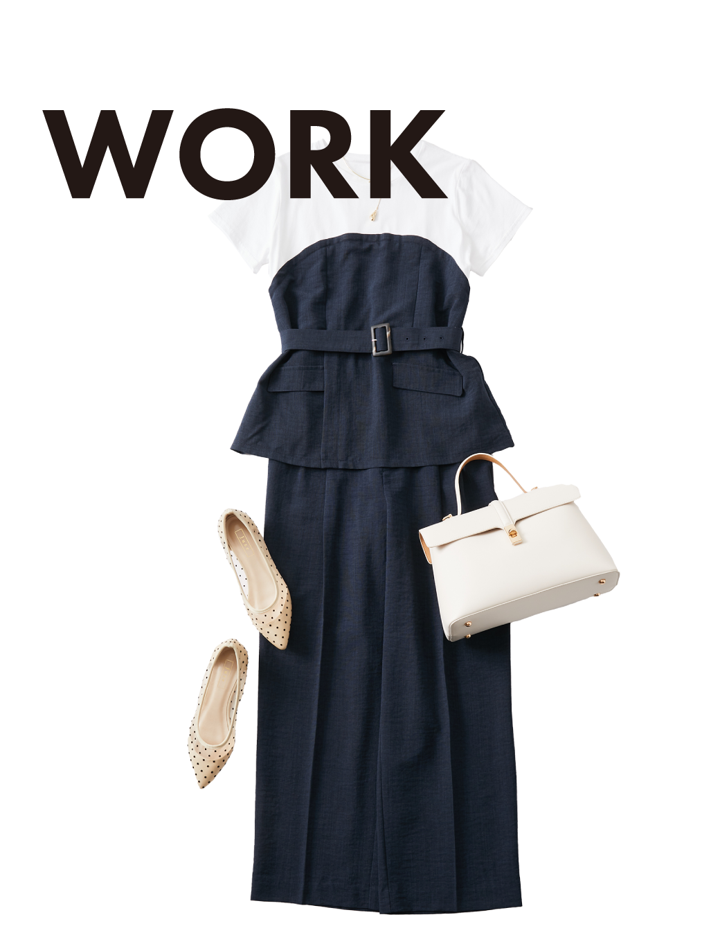 麻調の素材を使用した清涼感溢れるボトムスは、春夏の暑い日には嬉しい接触冷感機能付き。同色でまとめたTシャツとコルセットを合わせたようなドッキングトップスを合わせて、オフィススタイルにぴったりな上品さとおしゃれさのバランスを楽しんで。