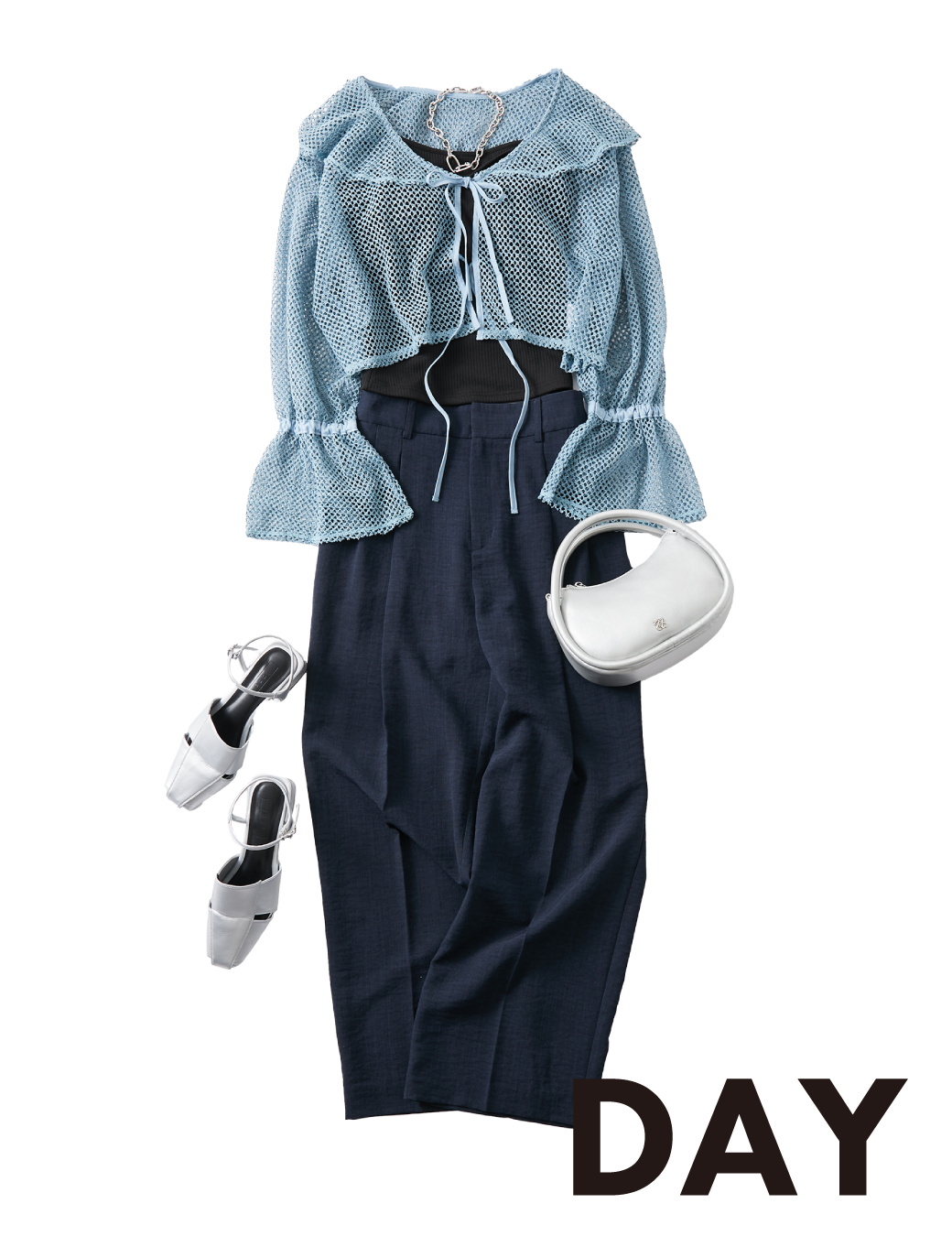 オフィスにぴったりなネイビーのパンツも、同じ青系のサックスブルーのメッシュトップスと合わせれば一気にカジュアルな夏スタイルに。小物をシルバーで統一することで、可愛さとクールさを併せ持ったスタイルに。