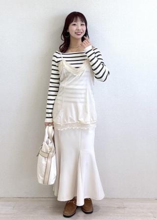 コントラストのきいたボーダー柄トップスと、濃いめのカラーのタイトスカートを合わせ、すっきりとしたIラインを演出。バッグはカチッとしたエレガントなレザー調を、足元はプレーンなパンプスが正解。コートは前を開けて羽織れば、より縦のラインが強調されます。