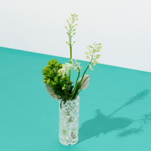 光を受けてキラキラ輝く〈KEISUKE ISHII〉の「Fuse nf013」はまるで氷のオブジェのよう。花や水の入れ替えがしやすいよう内側にはガラス管が設けられています。「存在感がある花器なので葉の表面に白い絹毛を持つダスティミラーを軸に、柔らかい印象に仕上げました。全体はグリーンのワントーンでまとめ、あえて毛色の違う植物を合わせて深みを出しています。高・中・低と3種類のグリーンの高さに差をつけることで、上に伸びていくようなシルエットに仕上がり、バランス良くまとまりますよ」(チーコさん)。