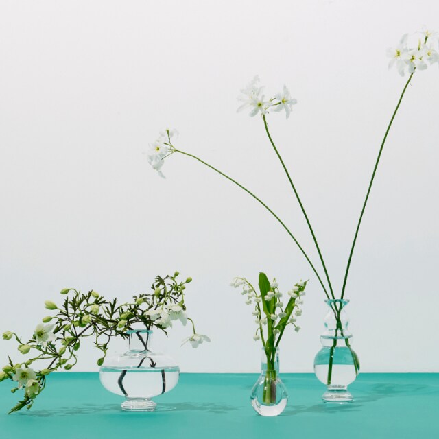 分厚いガラスのぽってりとした質感が印象的な〈LAN〉の花器。アンティークの香水瓶をイメージした「perfume bottle vase」(写真左・中)はフタ部分も花器として使うことができ、短くなった花も最後まで楽しめます。新作の「flower vase C」(写真右)は、ひとつひとつ表情の違う膨らみのあるボディが特徴的。「花器のフォルムを際立たせるために、白いお花を1種類ずつ選んでみました。1種類のお花でも見応えがあってバランスもいいですよね。『perfume bottle vase』のようにお腹にボリュームがある花器はバランスをとるのが難しいので、たわんでいるお花を選ぶと生けやすいですよ。フタ部分は安定感があってお花も立ち上がりやすいので1つ持っておくと便利ですね。スズランのように小花がたくさん連なったお花を合わせると本数が少なくても見応えがあります。『flower vase C』に生けたリューココリーネはあえて細長い茎を切らずに生けることで、重みのある花器でものびやかなイメージになります」(チーコさん)。