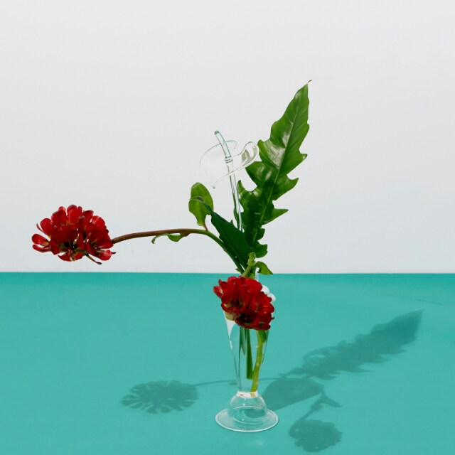 豊かな自然と人々が共存する軽井沢の地をガラスワークに落とし込んだという〈ANDSPACE by TOUCHU(アンドスペースバイトウチュウ)〉の「KRZ1」。同じ透明ガラスのアンスリウムのガラスフラワーと生花とのコンビネーションがアートピースのような美しい佇まいに仕上げます。「この花器は土台がしっかりとしているので茎が長いお花を生けても倒れにくくて、遊びを入れられます。今回は、縦長なシルエットのフィロデンドロンと、横にくるんと伸びたレオントキール・オバレイを合わせて動きを出してみました。ガラスフラワーは、お花のお世話が苦手な方でも楽しめるので便利ですよね。ガラスだけだと無機質な印象ですが、グリーンが入ることで動きも出て面白くなります。フィロデンドロンのように面が広い葉っぱを合わせるとガラスフラワーがより引き立ちますよ」(チーコさん)。