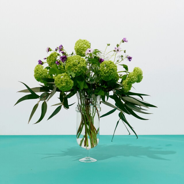 こちらのアレンジメントの主役になるのは〈ANDSPACE by TOUCHU(アンドスペースバイトウチュウ)〉のガラスフラワー。ふくよかなボディと安定感のあるグラスの持ち手のような土台が自慢の「onefat」に複数のガラスフラワーと生花を合わせることでさらに華やかさが満点に。「ガラスフラワーをメインに、脇役として引き立たせてくれるユーカリやビバーナム・スノーボールと、動きをつけてくれるギリアを選んでみました。ガラスフラワーはロングとショートを。生花の長さを変えて生けることで、全体の均衡が保つことができます。パフェカップのような形の花器なので、まあるく広がるように生けると全体のシルエットがまとまりやすくなりますよ」(チーコさん)。