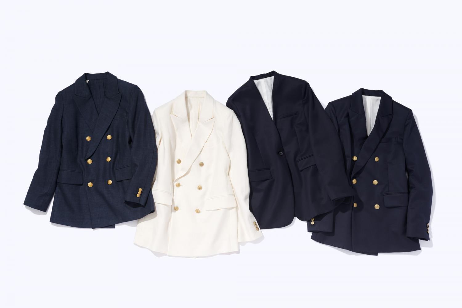 トップメゾン御用達のイタリアの名門「SOLUZIONI TESSILI」社のリネンウールを使用したダブルジャケット(ネイビーとホワイトの2色)と、シルクのような艶感が美しいウールモヘアのダブルジャケットとカラーレスジャケットの4アイテム。