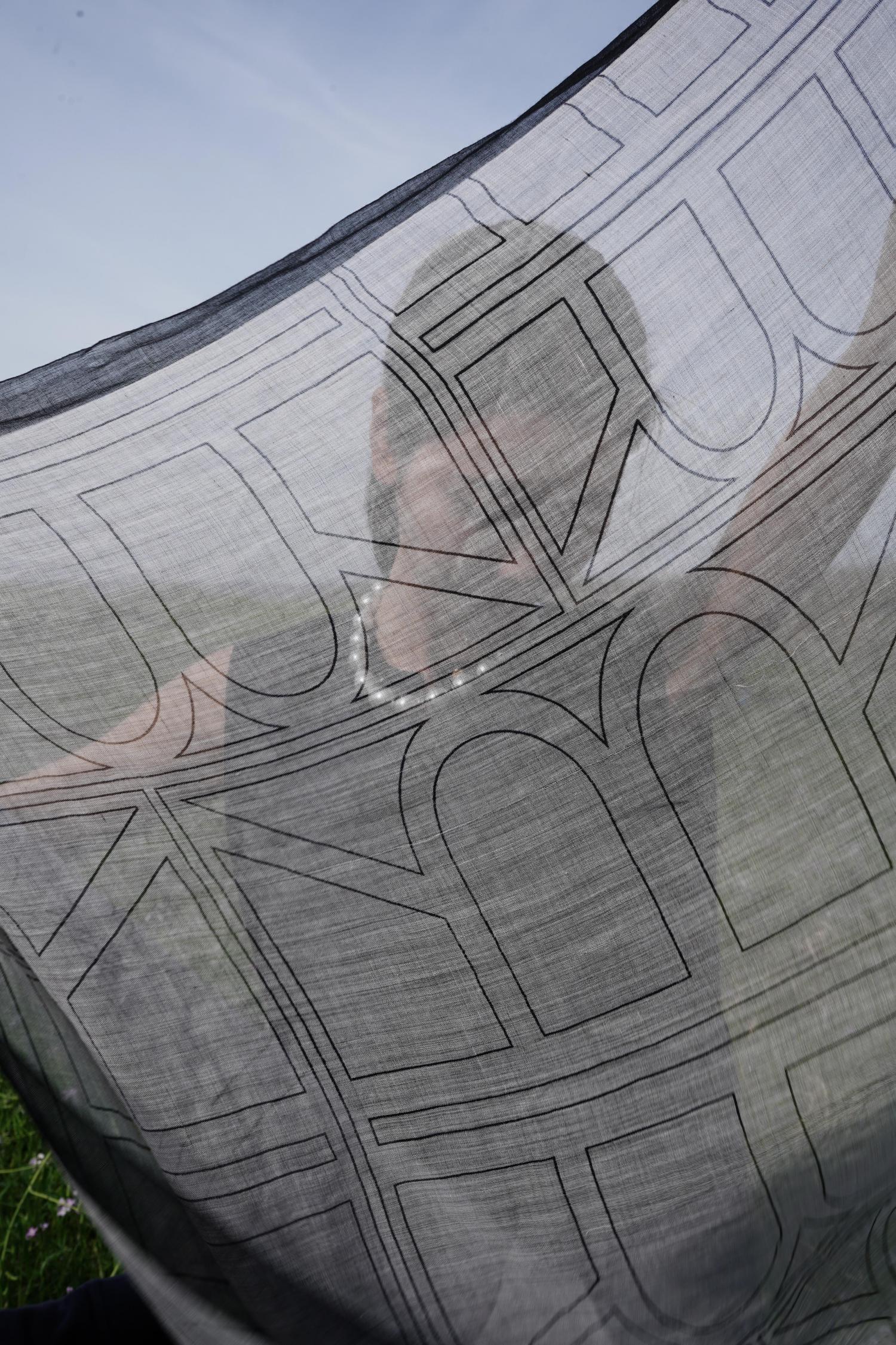 細く長く魅せるIシルエットのリネンドレスにはヘッドスカーフとサングラスを合わせて、シネマ女優のようなノスタルジックなスタイルに。
