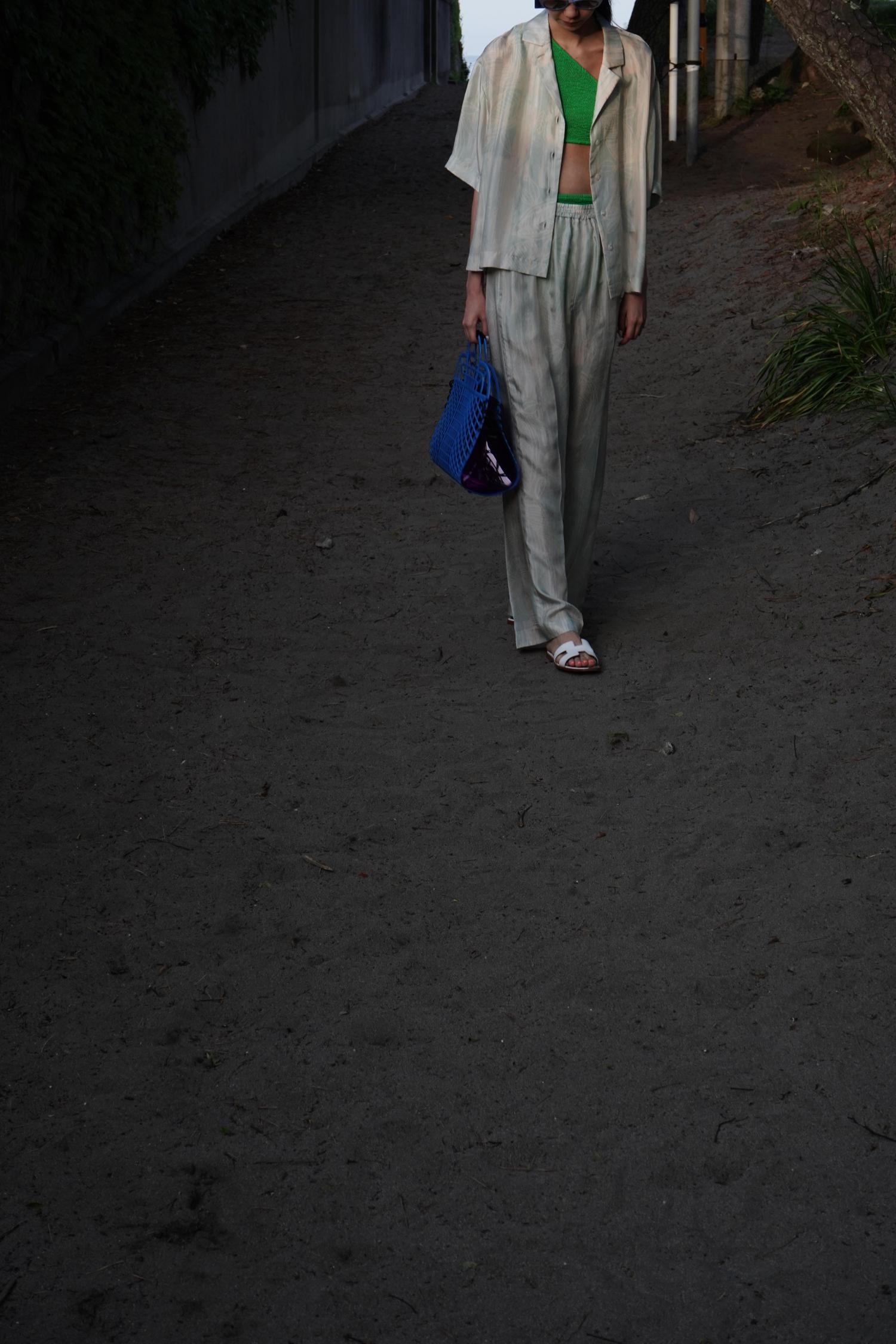 シアーでドラマティックなドレスにゴージャスなタイガーアイのアンハンブラのロングネックレス、そして「cargo」の籠バッグ。これぞ!飾らない、クワイエットラグジュアリーなスタイリング。