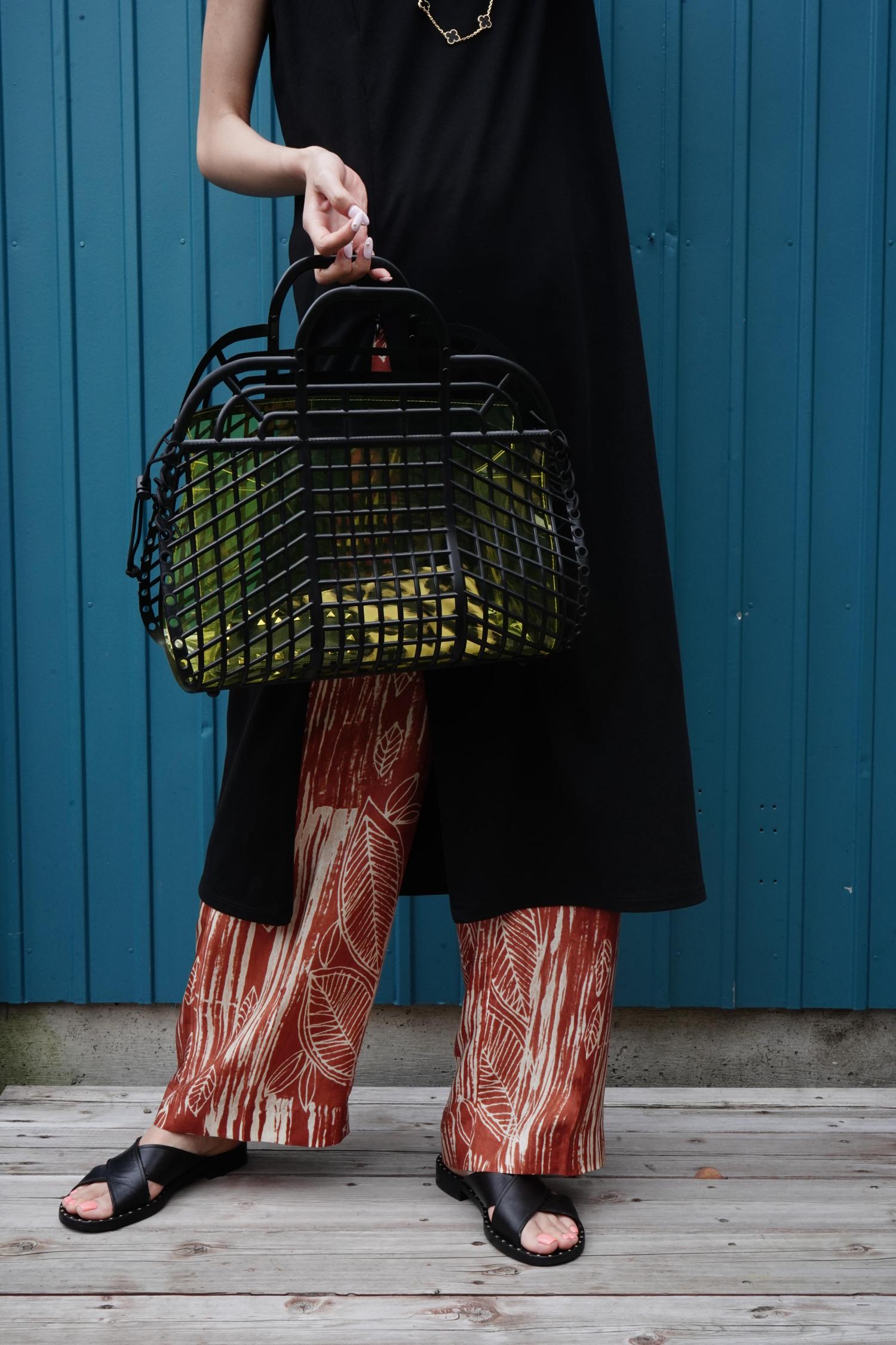 今回「gentle woman in love」のためにストリングを黒にカスタムした「cargo」のブラックの籠バッグを。