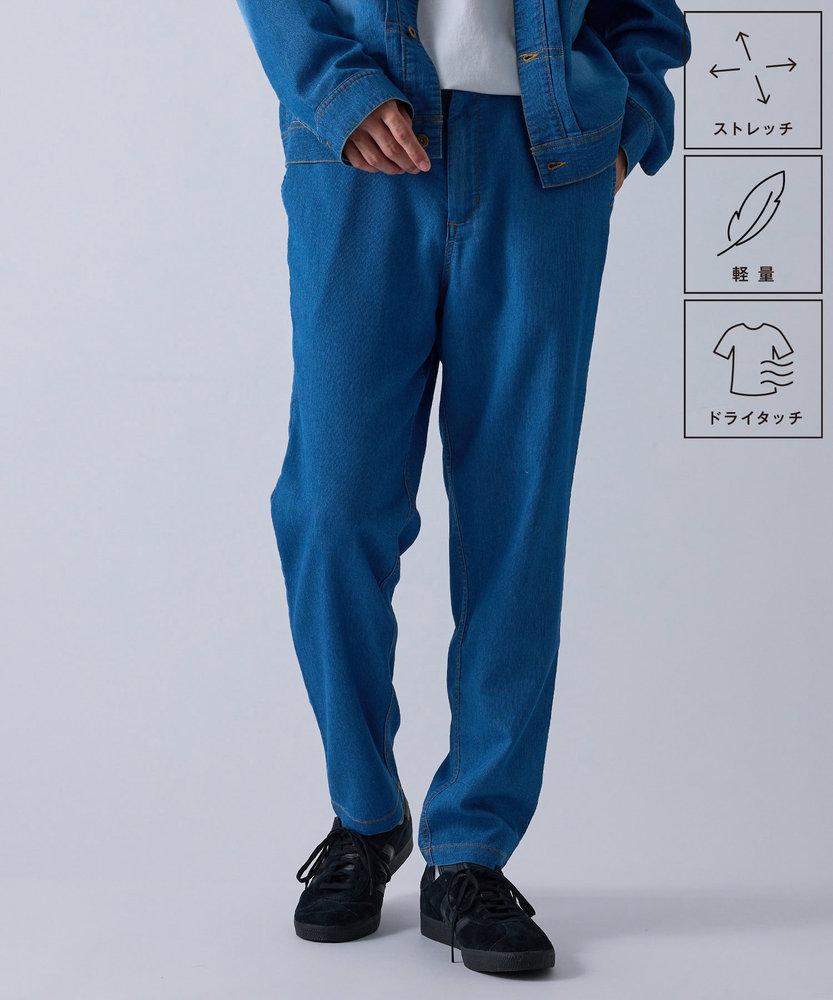 清涼感のある生地に加工をほどこし、デニムのような表情を持たせた軽さが特徴の素材