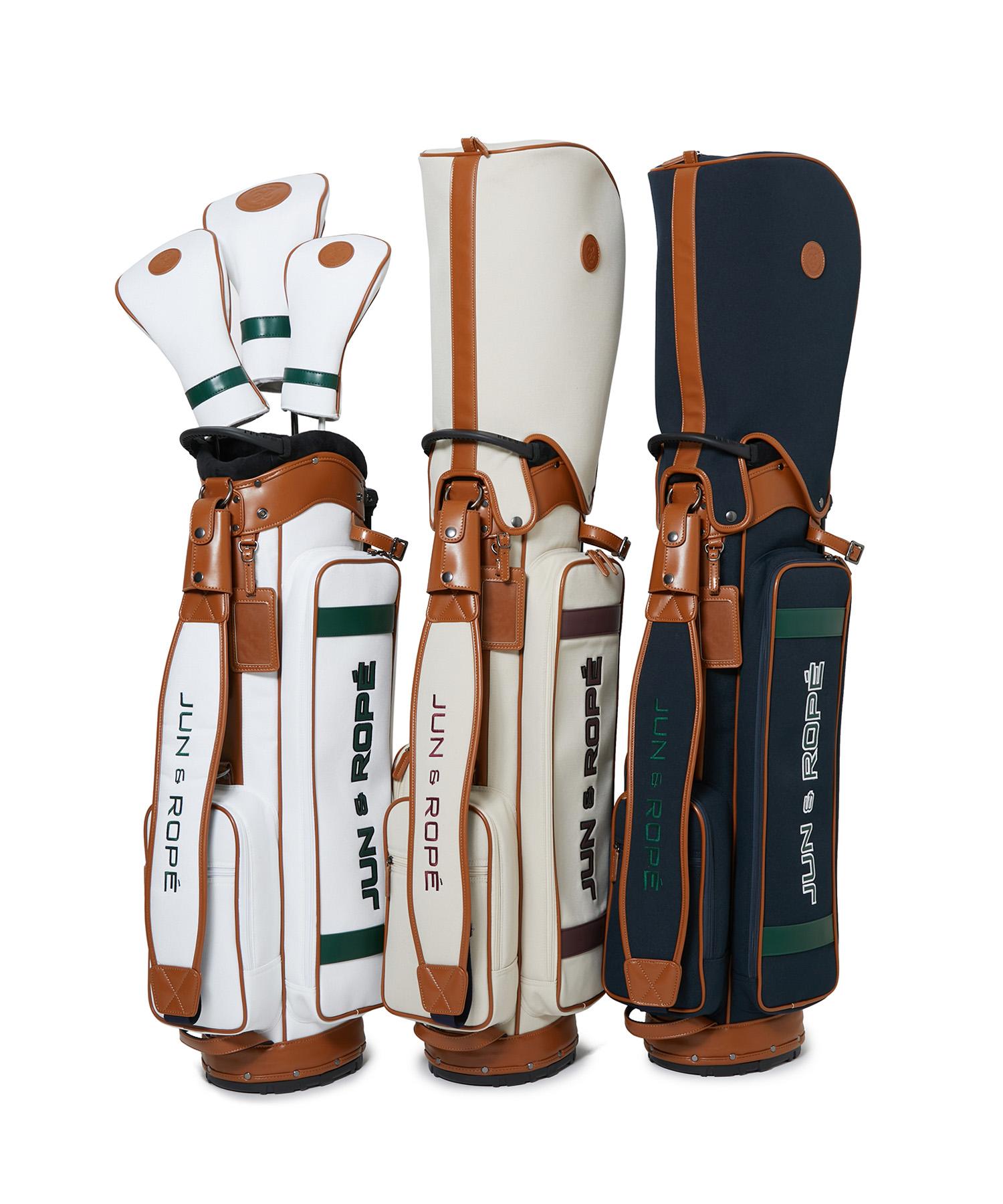 カレッジロゴの刺繍を施したスタンドタイプのキャディバッグ。持ち手やパイピングには合皮を使用し、さらにフードにはシーズンモチーフをかたどった合皮のエンボスロゴをプラス。 トラッドなベースに高級感のあるデザイン。