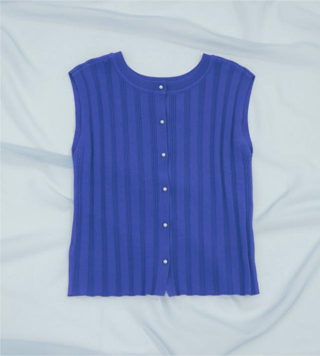 上品なパールボタンはバックスタイルにするとカジュアルスタイルにもマッチ。