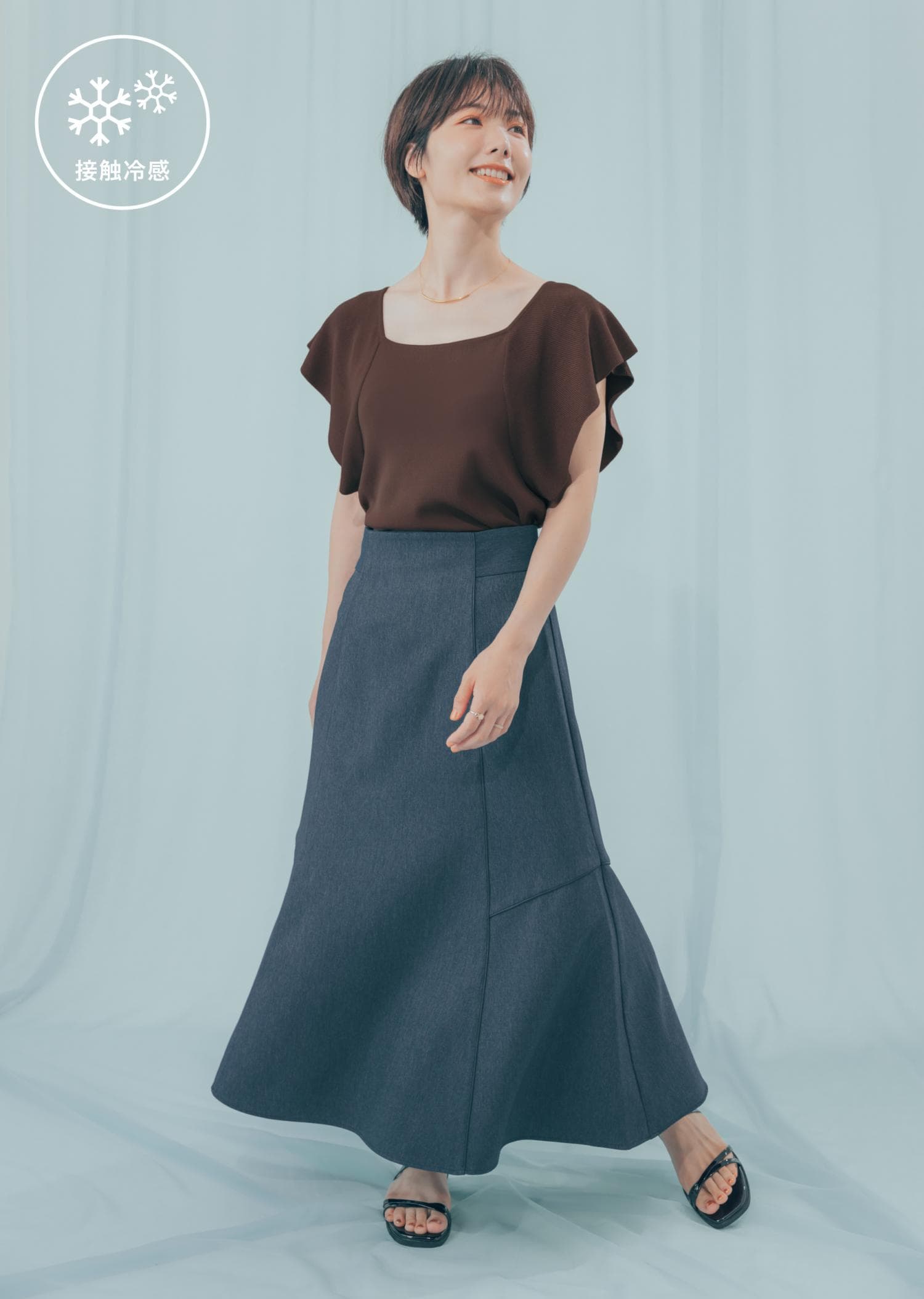 肩周り〜二の腕をカバーしてくれるフレアスリーブでひんやり可愛くスタイルカバーが叶う。 スクエアネックでデコルテはすっきりと。