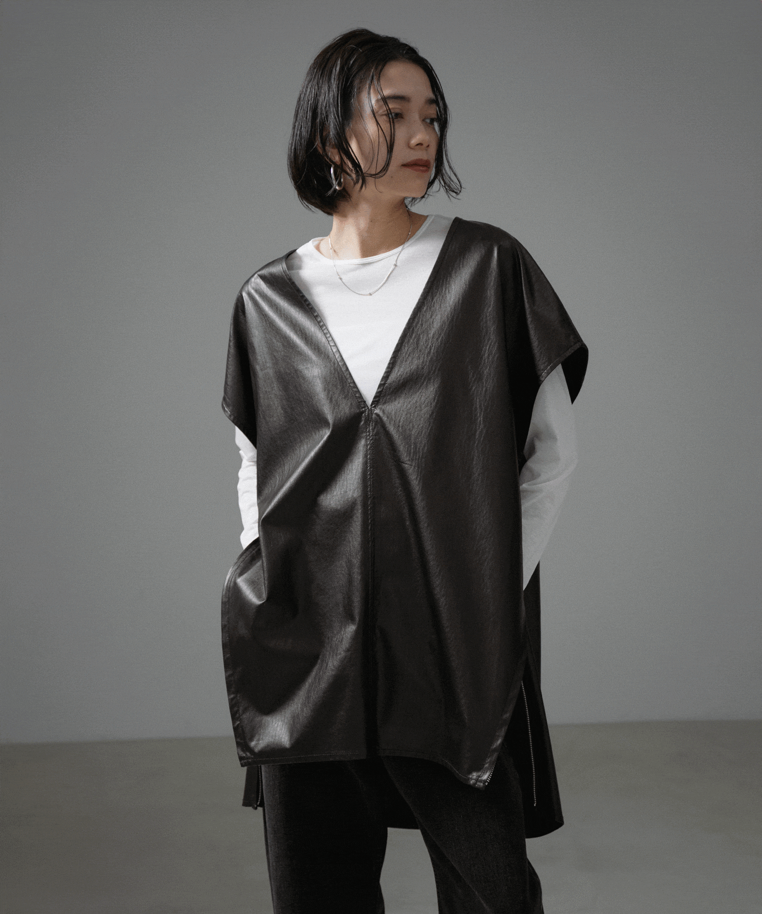 質感の良い柔らかな合成皮革を使用したノースリーブブラウス/ベスト