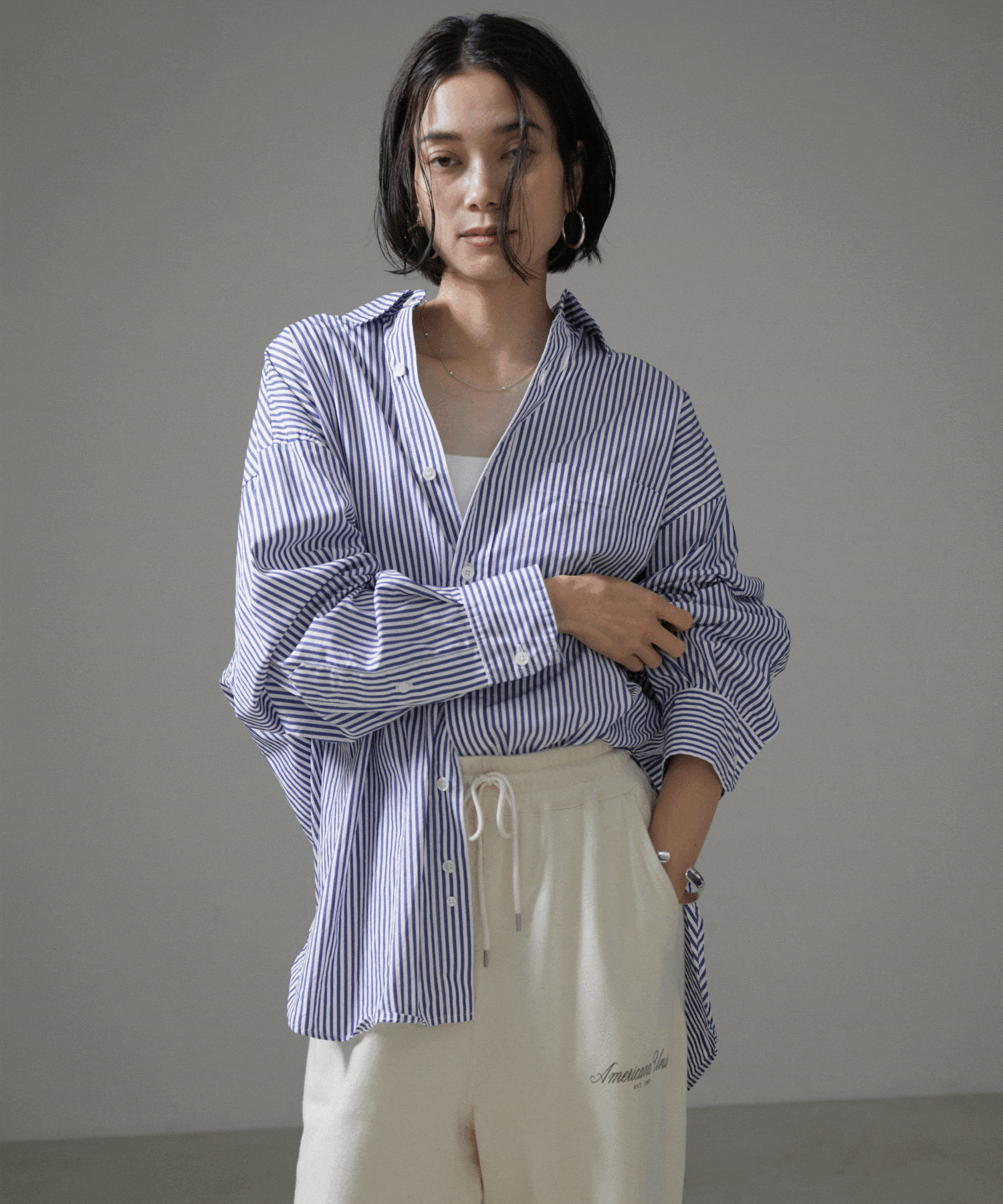 ゆったりとしたメンズライクなサイズ感に、大胆なスリットを入れたことで身体が泳ぐようなシルエットがポイント。