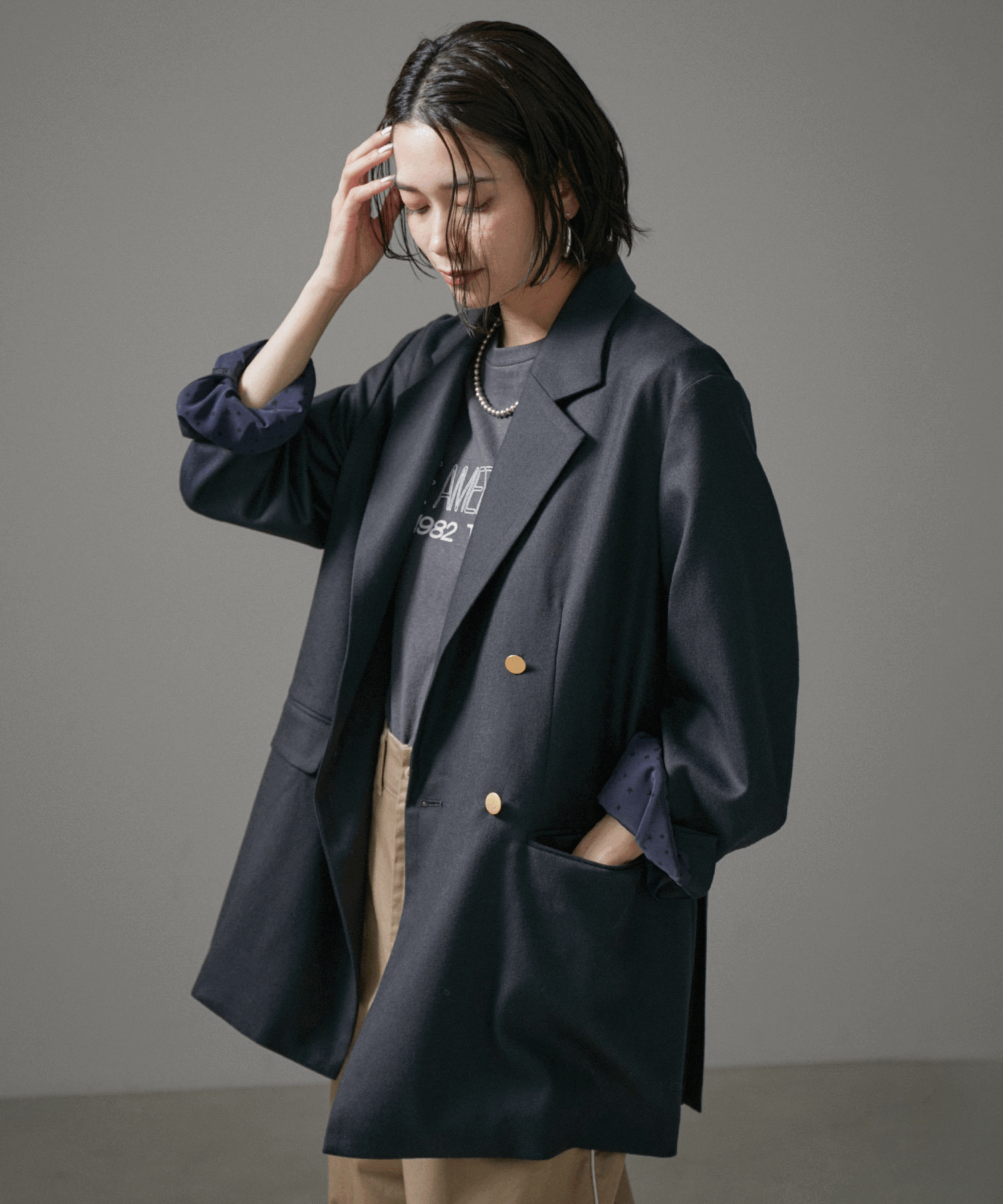 ゆったりしたシルエットとハードになりすぎない襟のデザインが魅力。