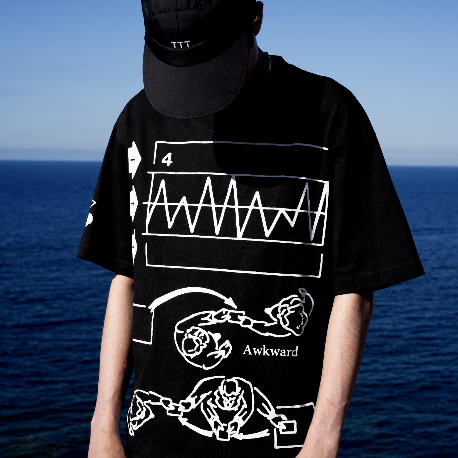今回のコレクションでもグラフィカルなプリントを施したショートスリーブ・ロングスリーブTシャツ、昨年The Trilogy TapesよりリリースされたREZZETTのEP『Boshly』のカバーアートをプリントしたショートスリーブTシャツ、オーバーダイ加工のクルーネックスウェット、タイダイ染めのナイロンリップストップ生地を用いたショーツ、キャップ類などが登場。