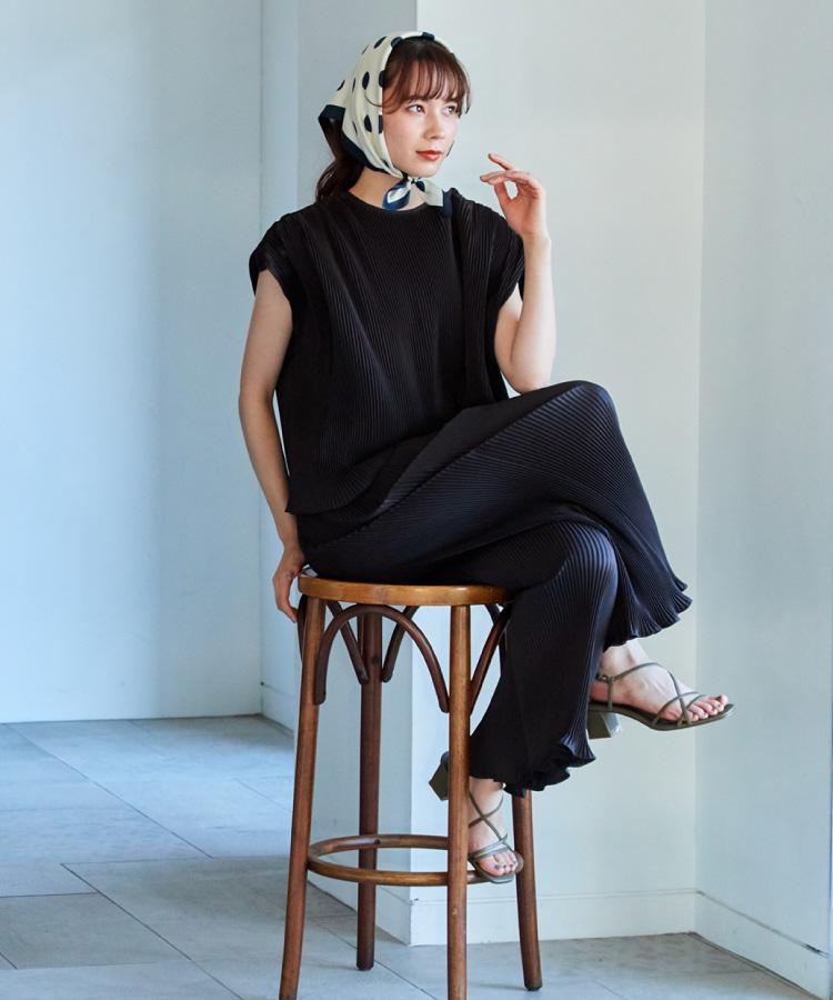 例えばプリーツのトップスは、気軽に着られてインナーとしても使いやすい、フレンチスリーブのTシャツ型。ともかく軽くてシワにもなりにくく、お部屋で過ごすときの強い味方です。セットアップで着こなせば、ちょっとしたお出かけにも対応可能に!