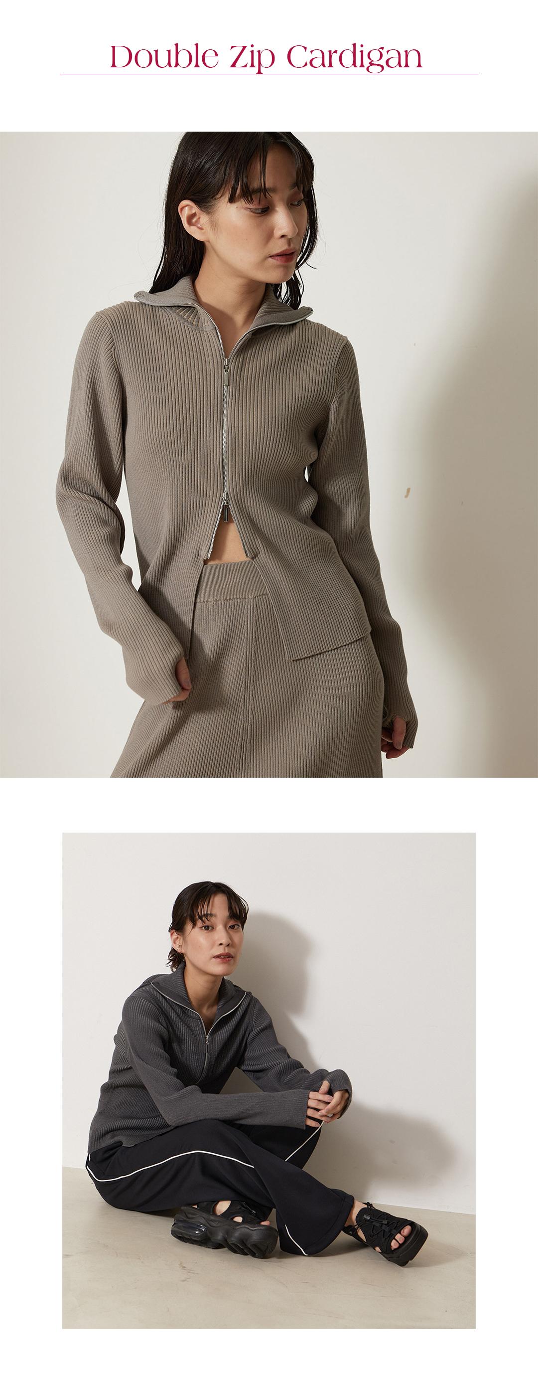 フロントZIPが効いたニットカーディガンは、逆開ファスナーで着こなしのアレンジ可能です。