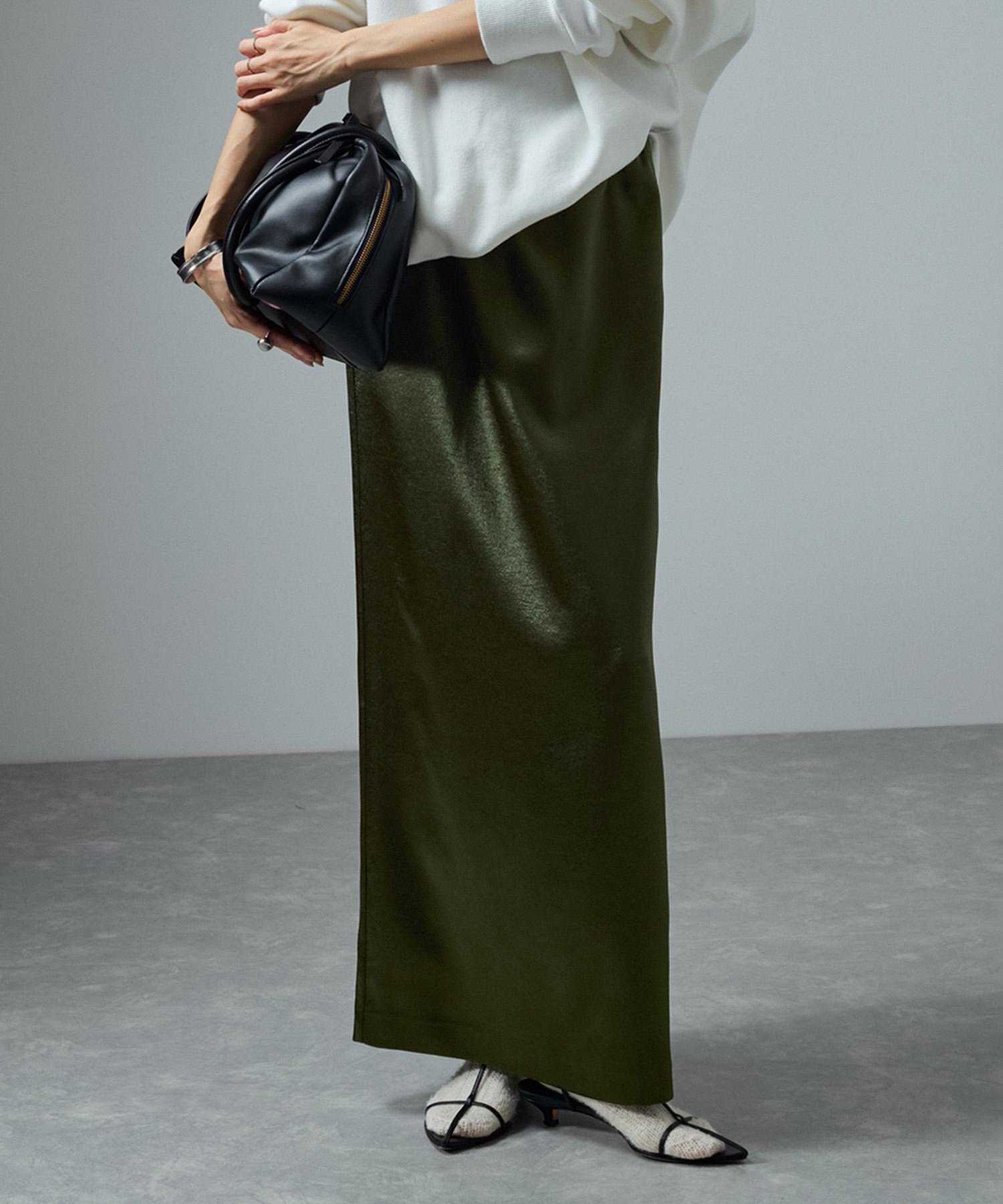 Iラインがクリーンな印象で、後ろのベントが脚をすらりと見せてくれる、大人のスタイリングに取り入れやすいシャイニースカート。