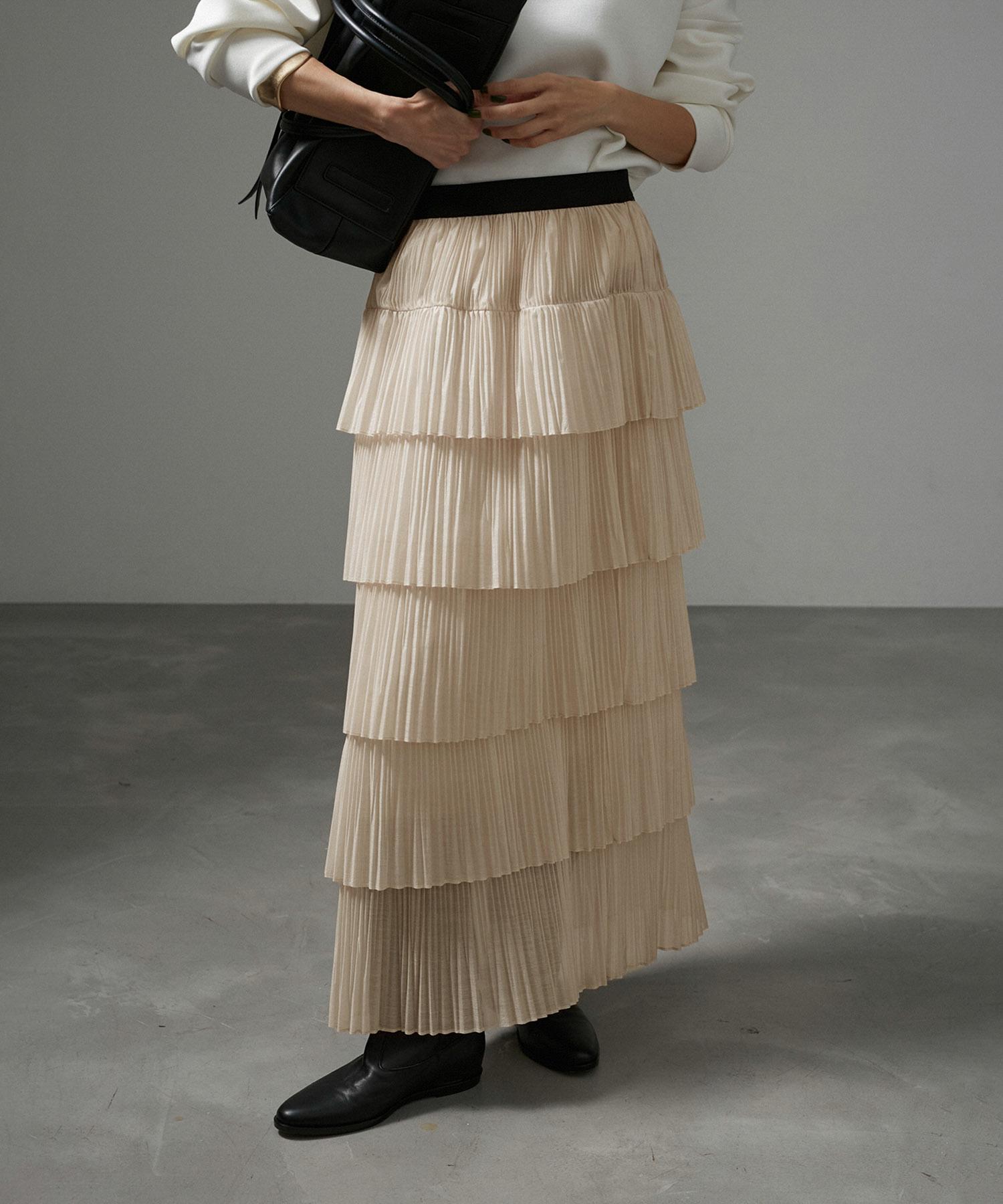 オーガンジー素材で軽やかなプリーツが上品な印象に。ウエストゴムで楽に履けるティアードスカート。