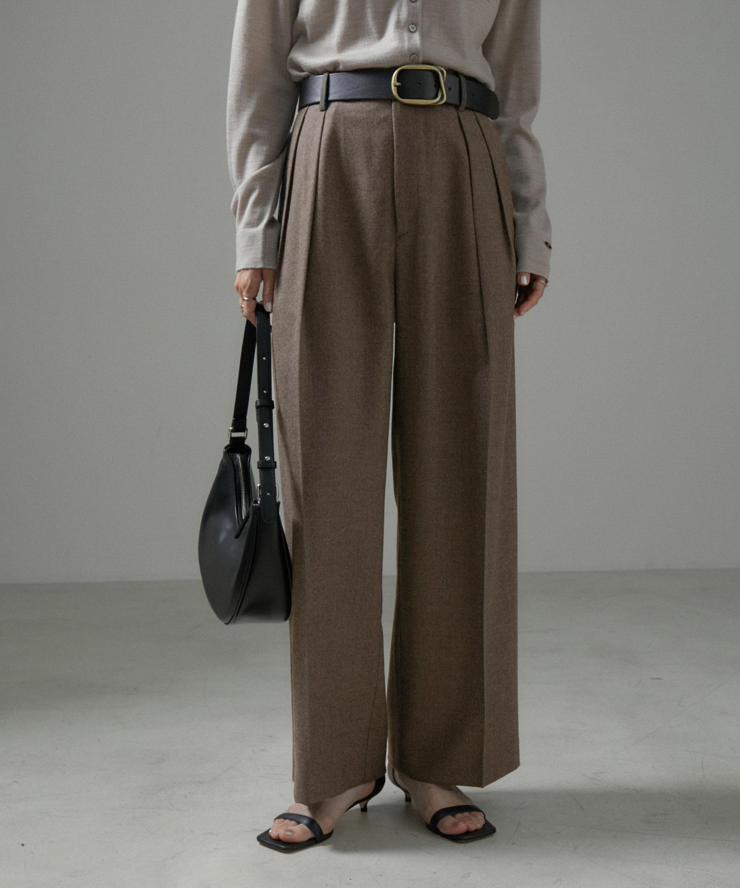 表情のあるメンズライクなフラノ素材を使用した美脚効果抜群のタックワイドパンツ。