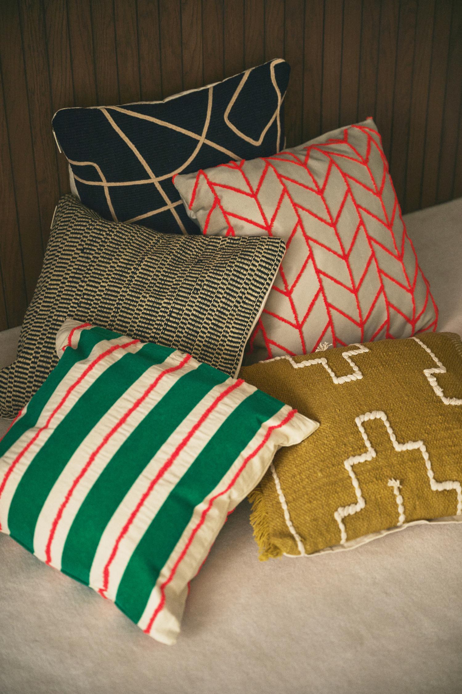 キャンバス生地にフロッキープリントや立体感ある刺繍が施されたクッションカバー。
