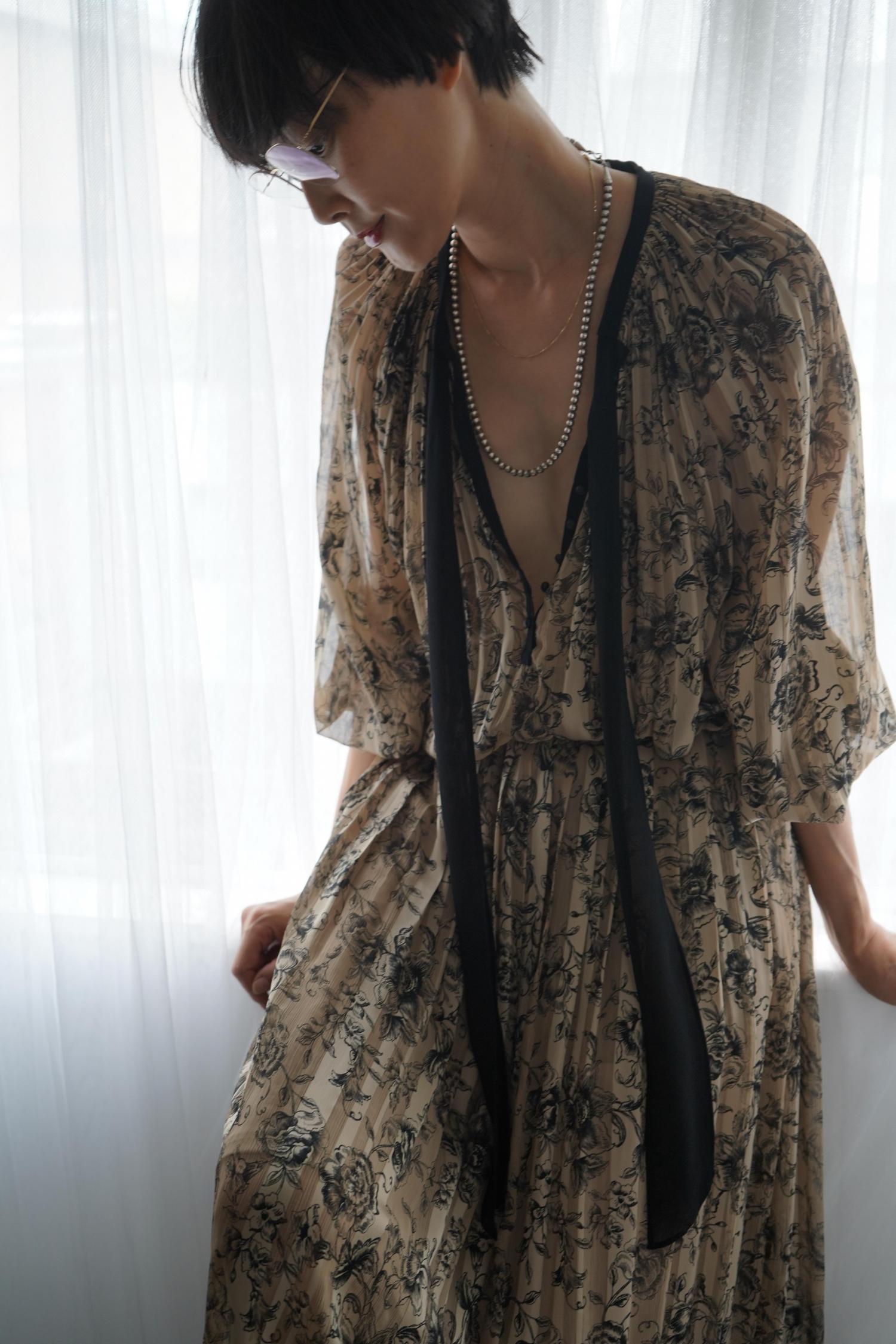 楊柳とサテンストライプの生地にプリントを施し、襟元と身頃はクリスタルプリーツ、スカートにはサイドプリーツをいれたエアリーなドレス。