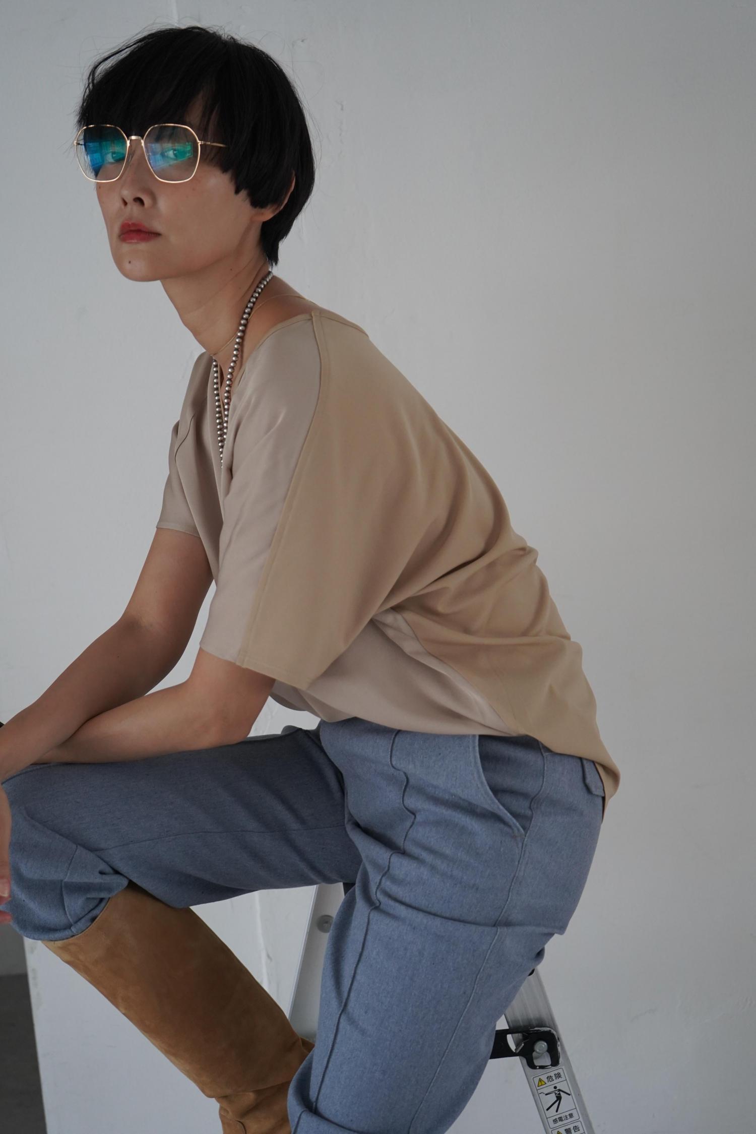 前身頃にサテン地を使用し、Vネックのラグランスリーブでスポーテイな顔に。後身頃はシルキーなジャージーを使用し、クルーネックドルマンスリープでリラックスした表情に。