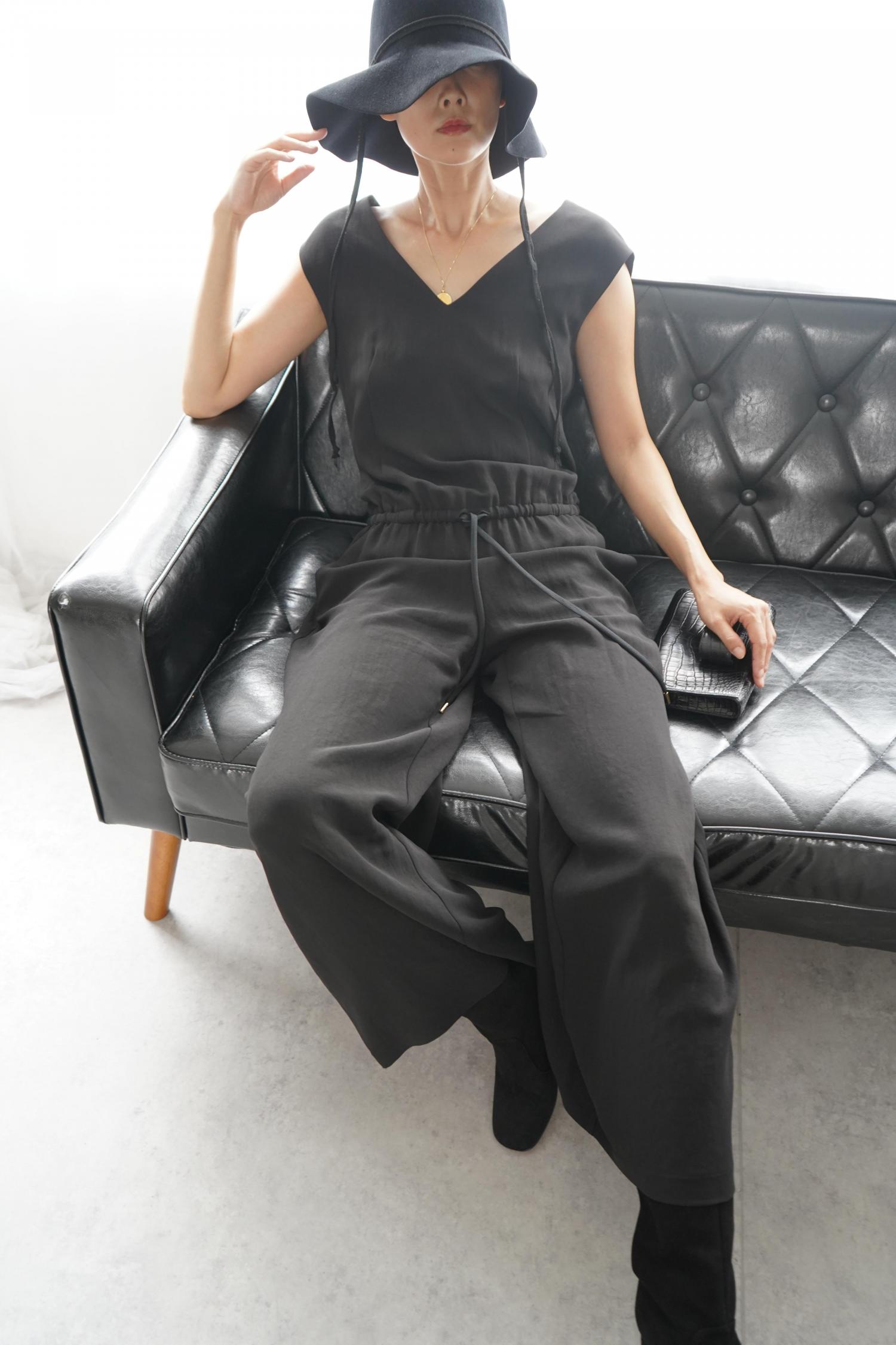 リラックスさとフェミニンさがミックスされたアセテートダブルクロスのオールインワン。ウエストゴムとコードで着心地もらくちん。