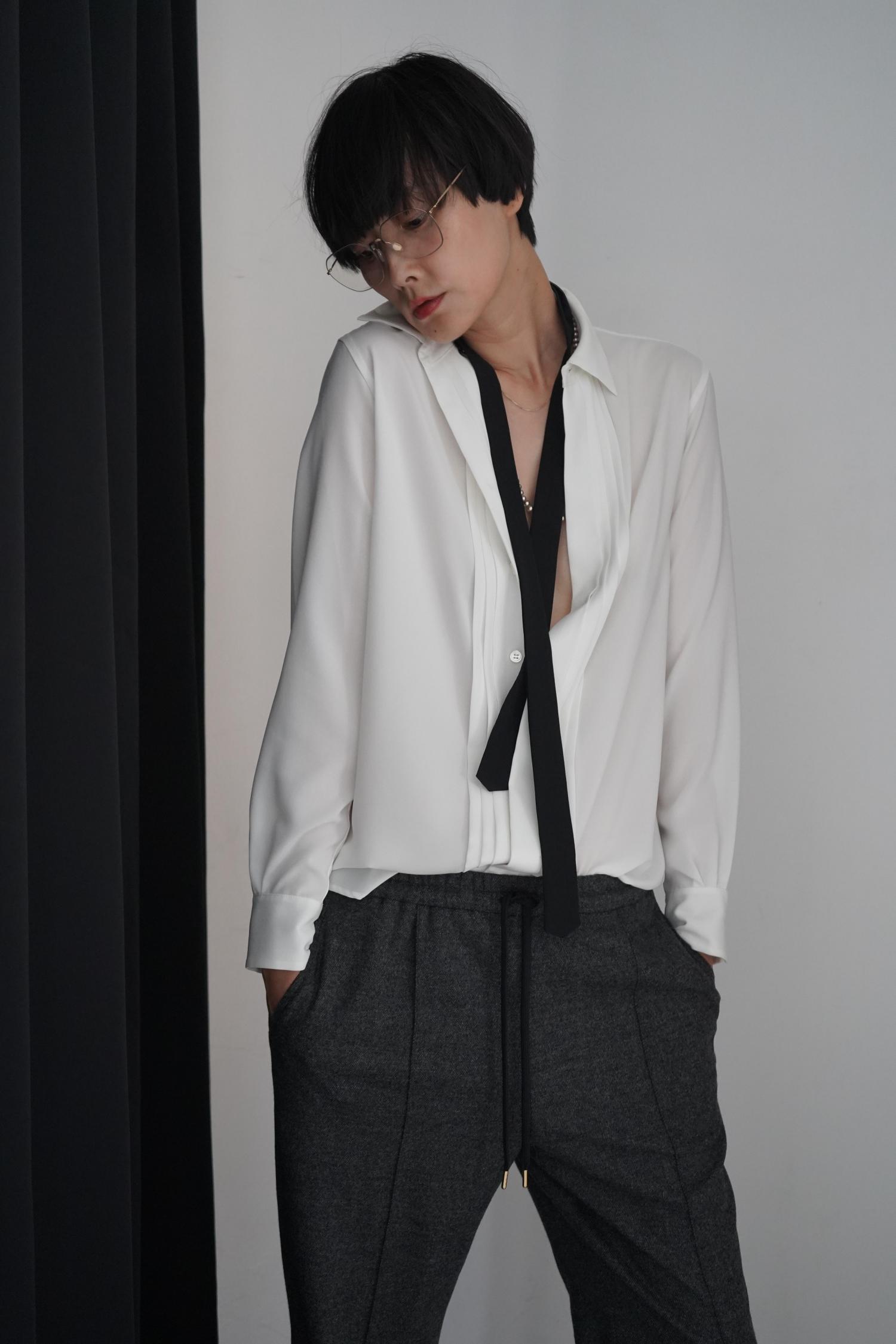 しなやかなテクスチャーとマニッシュさがミックスされた一着。小さな工場でベテランの職人さんによって丁寧に縫製されたリュンヌの代表的なブラウス