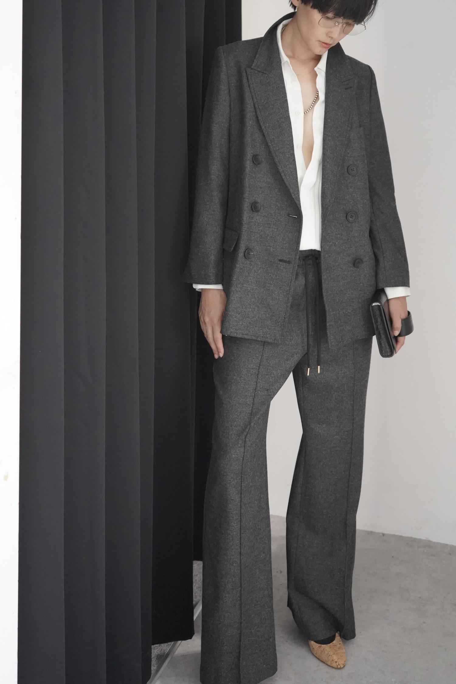 ペンシルスカートではシャープすぎるし身体の線がでてしまう。そこでできたのがタックスカードです。ジャストウエスト着用で足長効果があり、身体の線も拾わない。後スカートにはパンツと同じ顔の玉縁ポケットを付け、バックスタイルのアクセントに。
