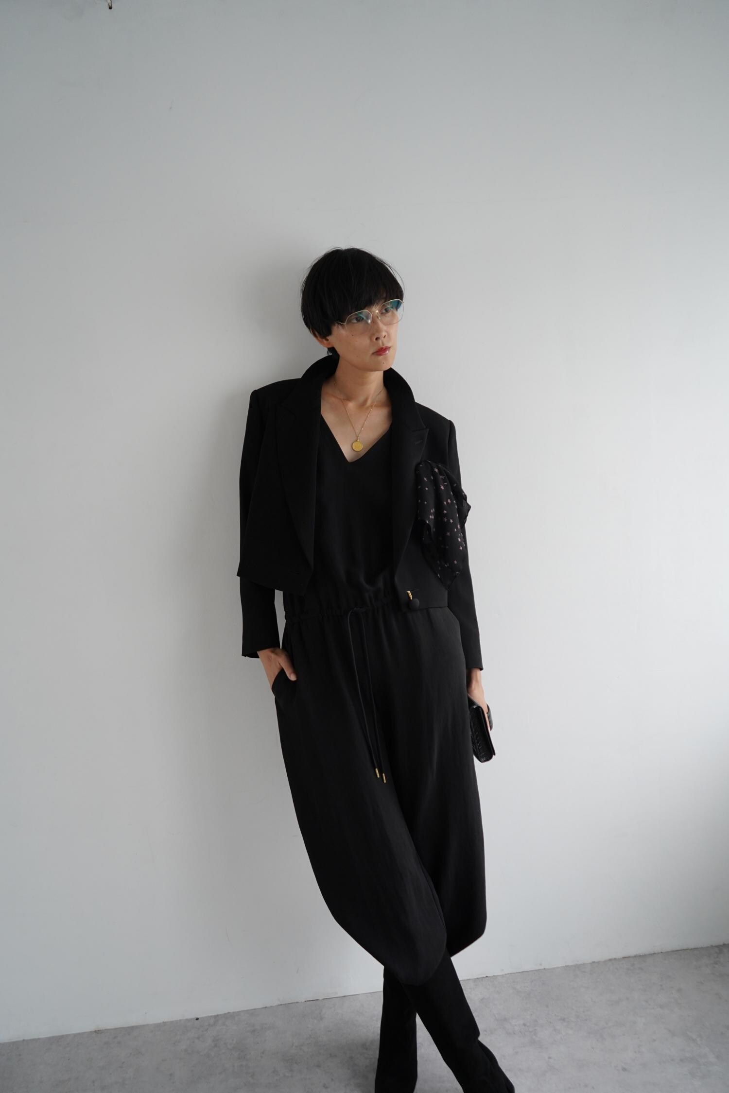 ウエストゴムとコードで着心地もらくちん。前後Vネックすることで、ネックラインの表情を楽しめます。天巾を広げて肩を少し落としてフレンチスリーブのように、天巾を狭くして、シャープなVネックに。ジュエリーが映える胸元です。