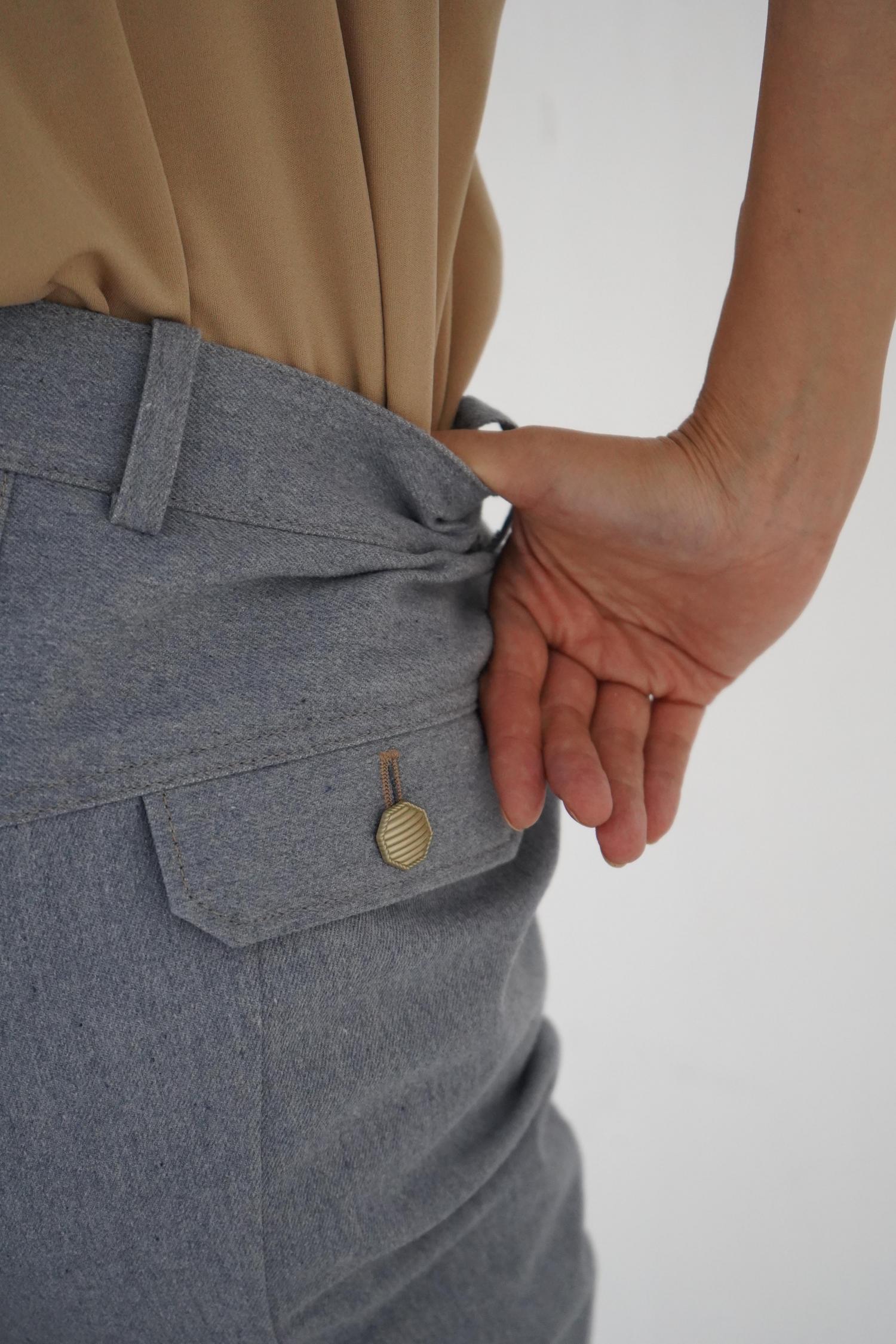 後ろのベルトは少しハイウエストにして、ウエストサイズはボタンで調整可。奥でとめると生地が膨らみ、ニュアンスのある横顔となります。