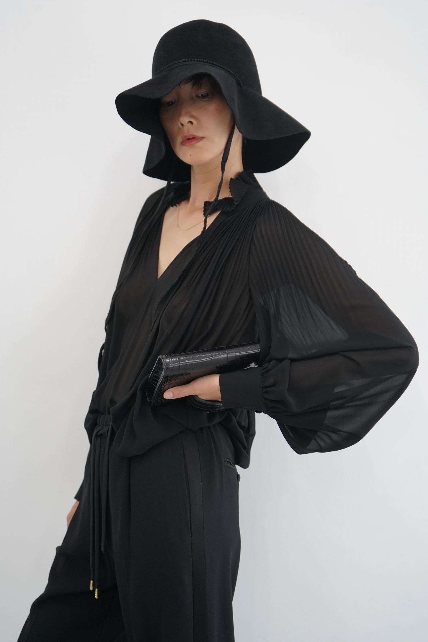 動く度に揺れるドレープが美しい一着。身頃と袖はプリーツを自然に消し、柔らかいシルエットを表現。