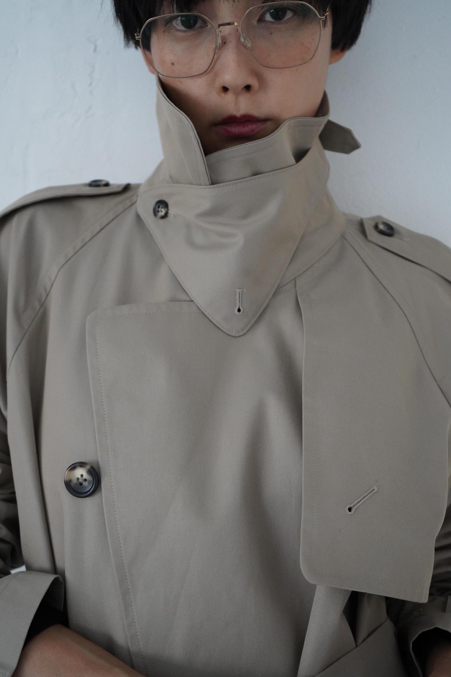 衿を立てて旅に出たくなる、トレンチコートの魅力ですね。衿を大き目に、決してビッグシルエットではない、ボックスライン。