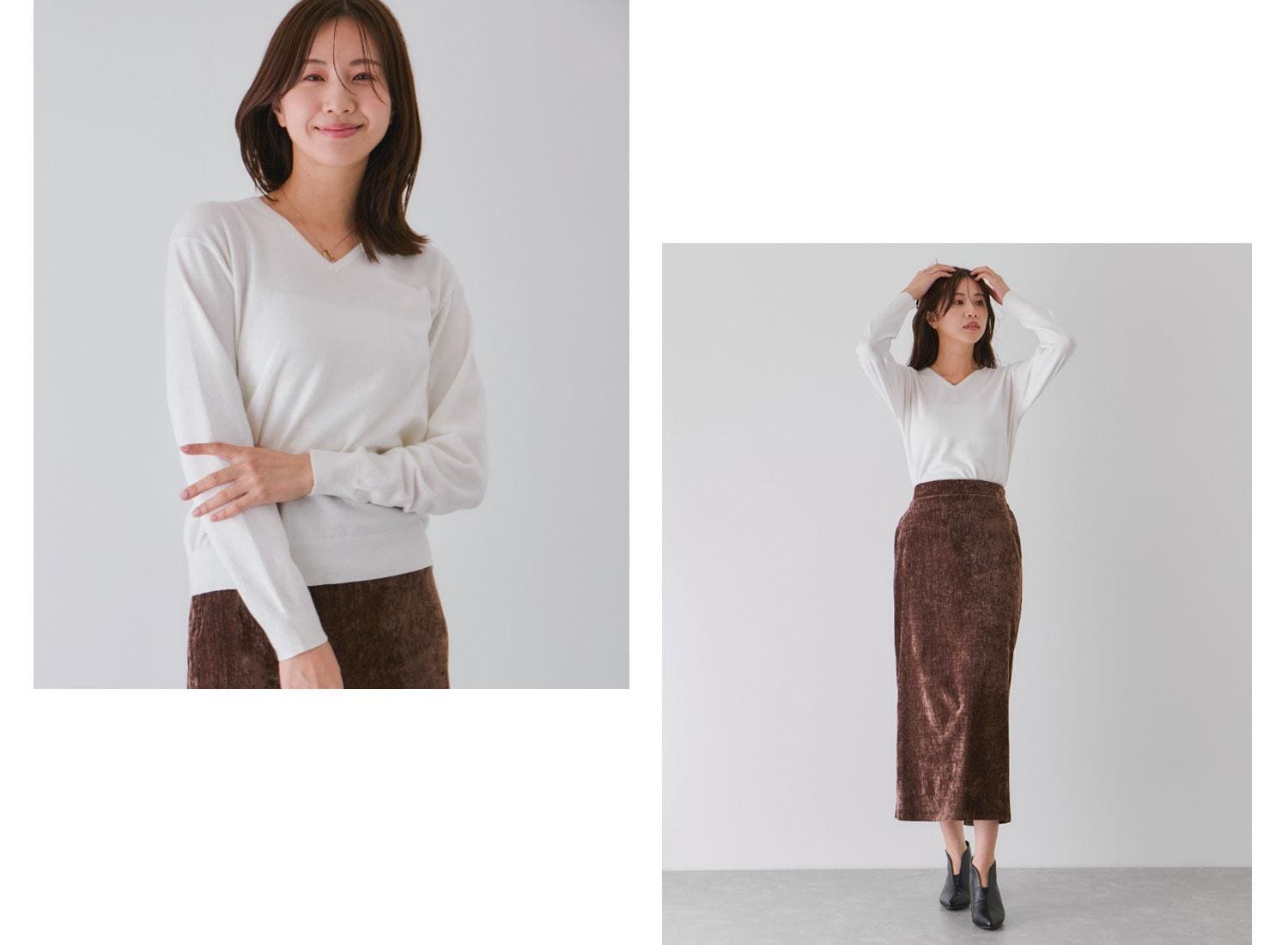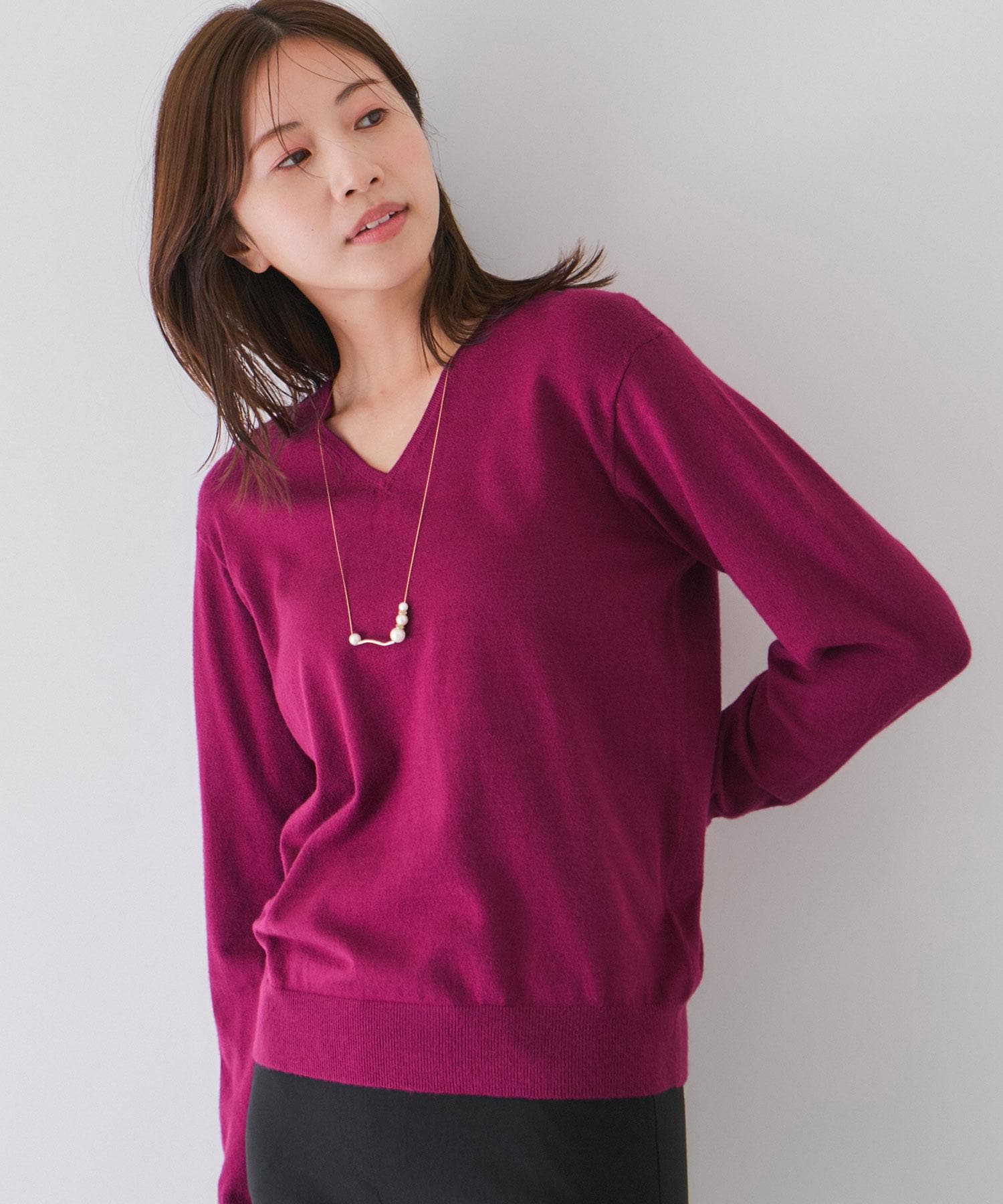 デコルテがきれいに見えるVネックがポイントで華奢なネックレスとも好相性。