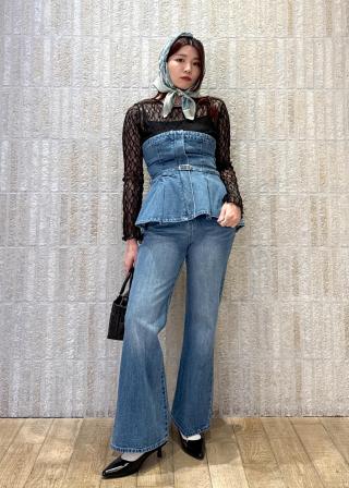 ひとワザ効かせたヴィンテージ風フロントホックデニムブラウスは、ウエストシェイプシルエットながら程よくゆとりのある絶妙なサイジング。この春トレンドのレース付きニットを覗かせて、上品なデニムコーデを楽しんで。