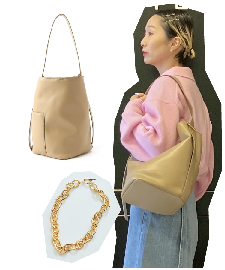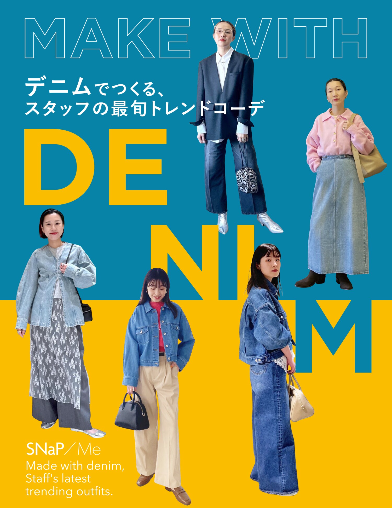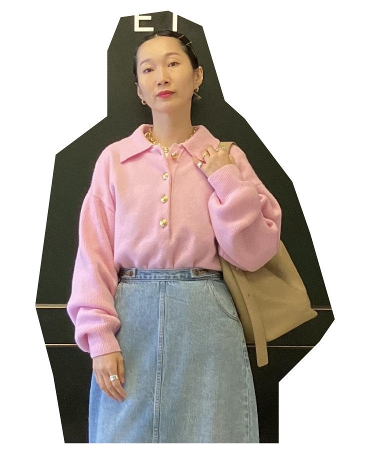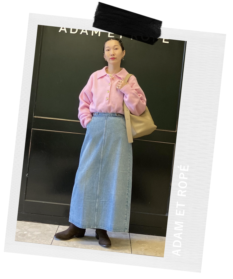 絶妙な色味のミッドヴィンテージブルーのデニムスカートに、着るだけで春を感じさせる柔らかなピンクのポロニットを合わせた、春らしい明るめカラーコーデ。