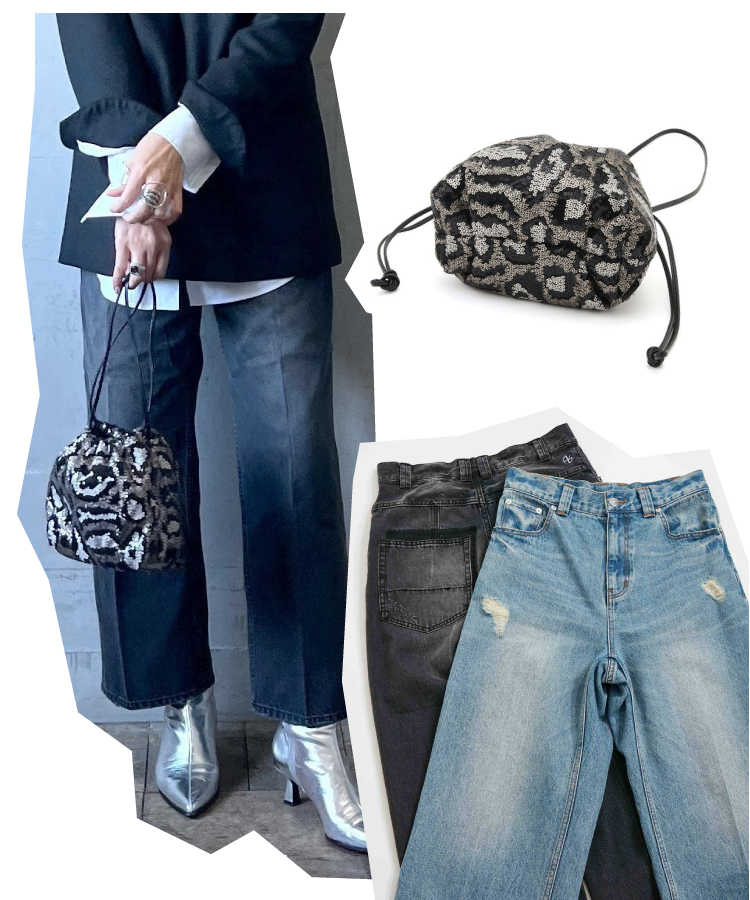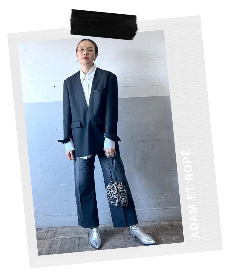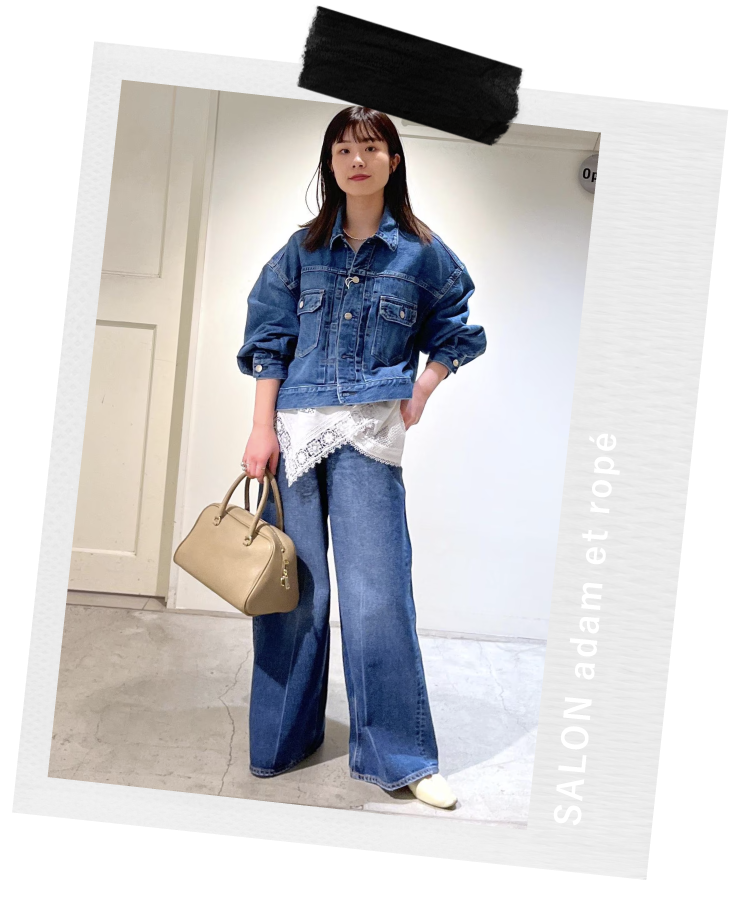 RED CARD TOKYOのニューシルエットジャケットに、今年トレンドのワイドなバギーパンツを合わせたコーデ。レースキャミソールをウエストからチラ見せすることで、カジュアルになりすぎない今年らしいバランスが完成!