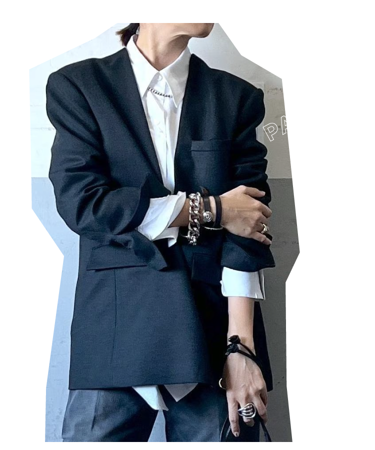 襟のないノーカラージャケットとオーバーサイズのシャツに、ヴィンテージライクなデニムを合わせた綺麗めミックスデニムコーデ。