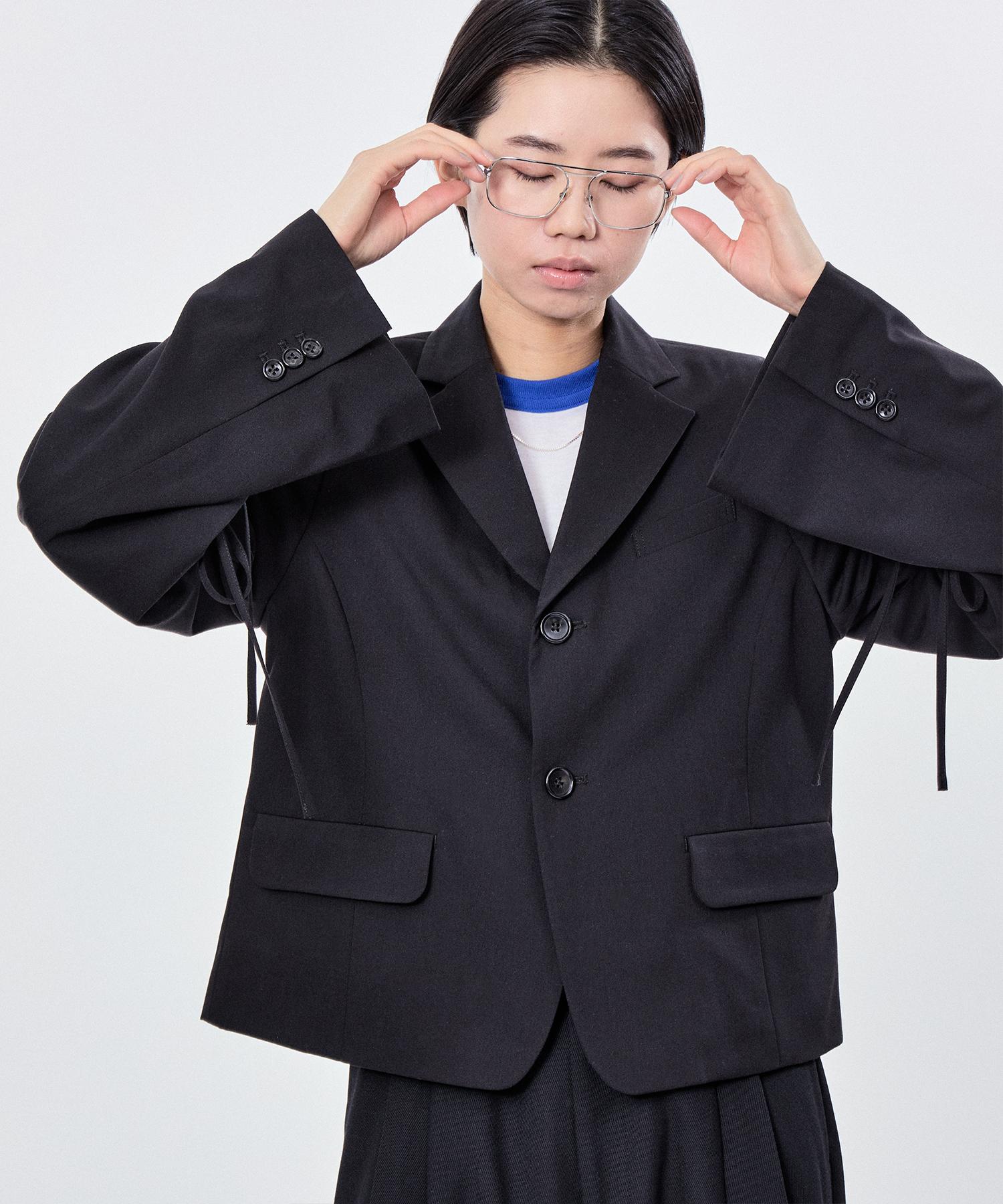 コンパクトな身頃に対して、太めの袖付けをしてイレギュラーなバランス感でデザインされたジャケット。 袖の分量を変形させるドローコードを内袖側に通していて、スタイリングのクセづけも楽しめるアイテム。