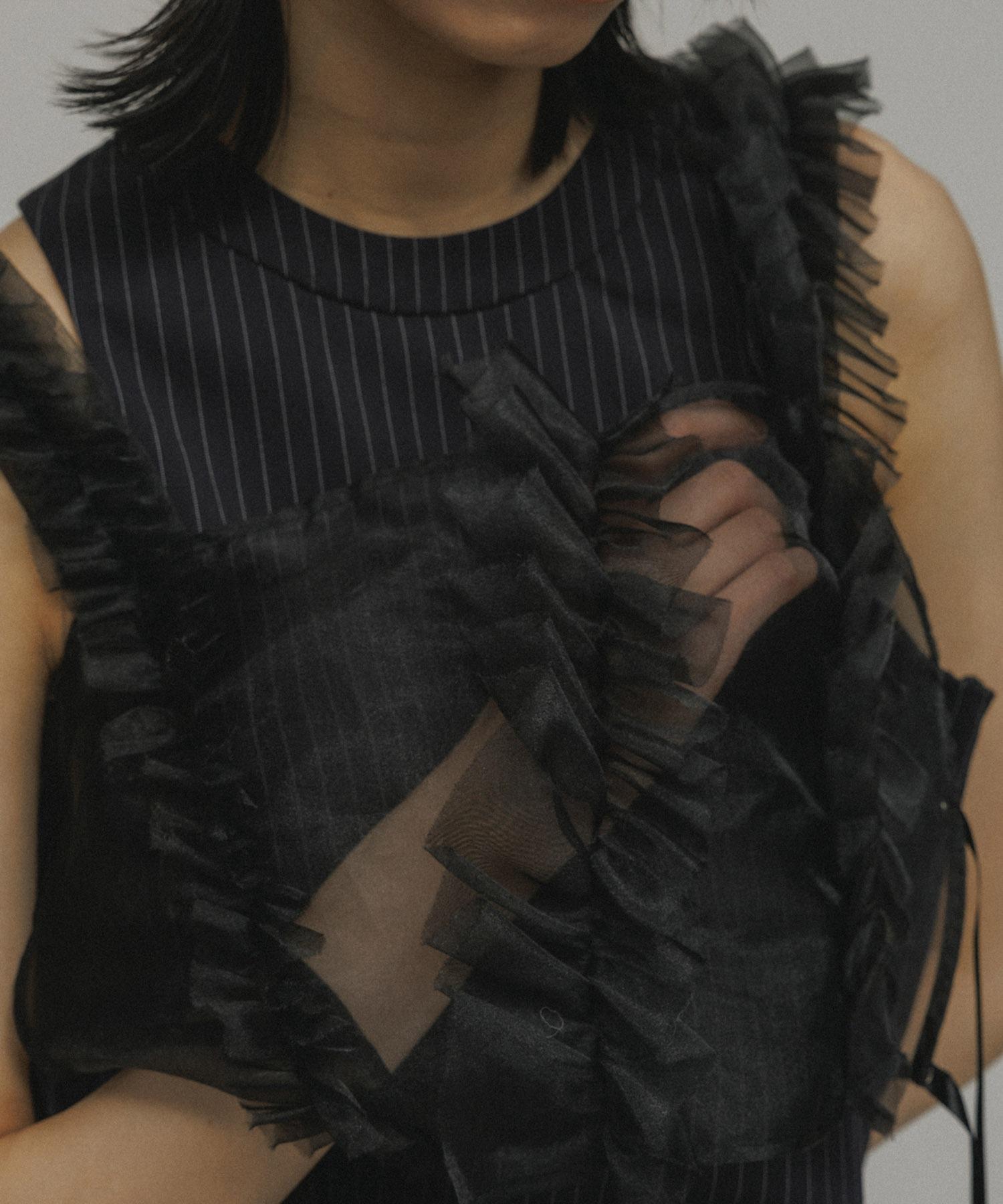 オーガンジーをデコラティブになりすぎない範囲でフリルを付け、様々なレイヤードコーディネートが出来るアイテム。 サイドを縫ってしまわずに、あえて紐の仕様にすることでTシャツ、ワンピースだけでなくコートなどにも合わせられるようになっています。