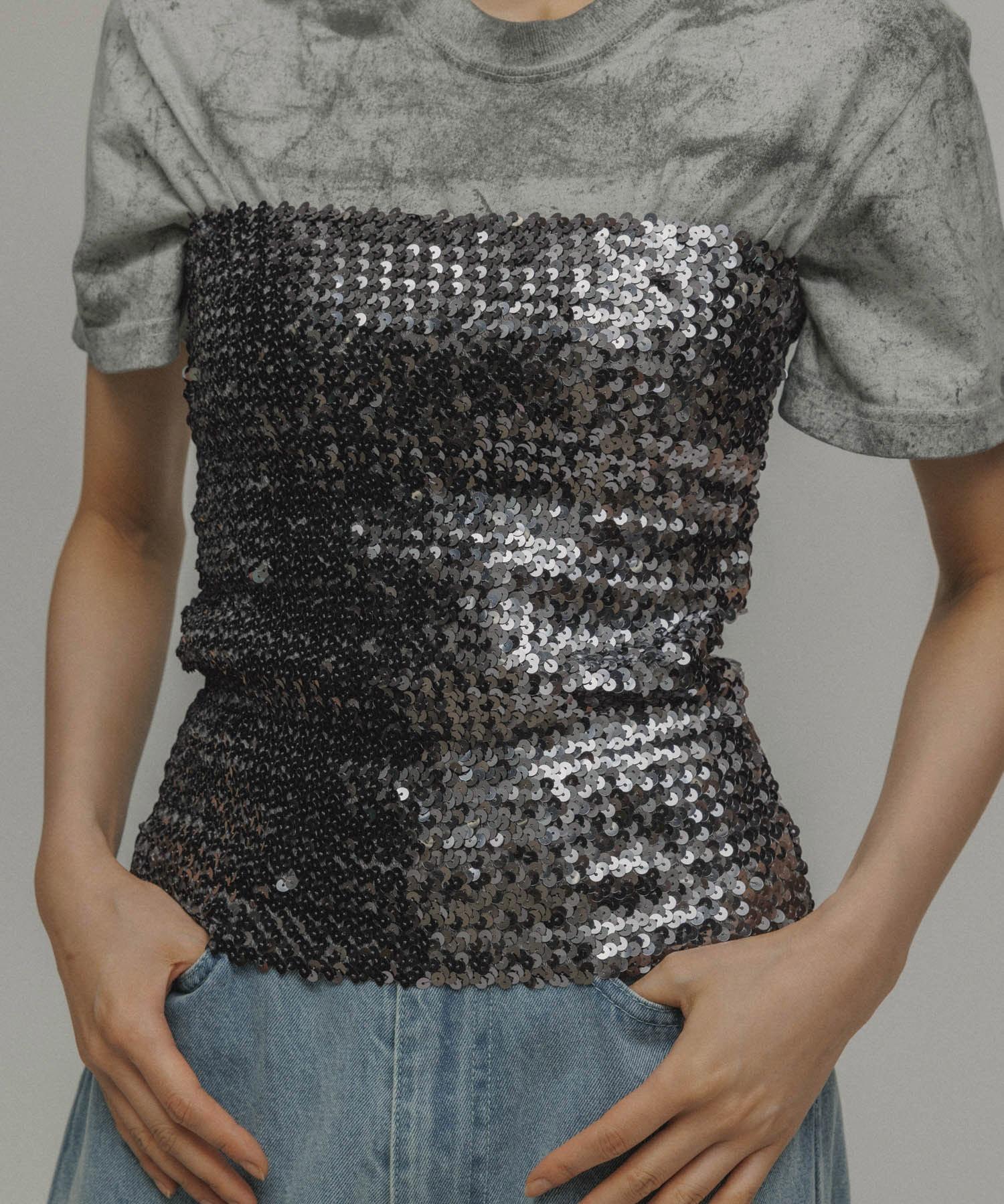 ビンテージビスチェをイメージソースに特殊編み機で生地から作成したスパンコールニットベアトップです。 スパンコールの色やニットの素材感などを別注したオリジナル素材を使用。アクセサリー感覚で使える遊び心の効いたアイテムです。